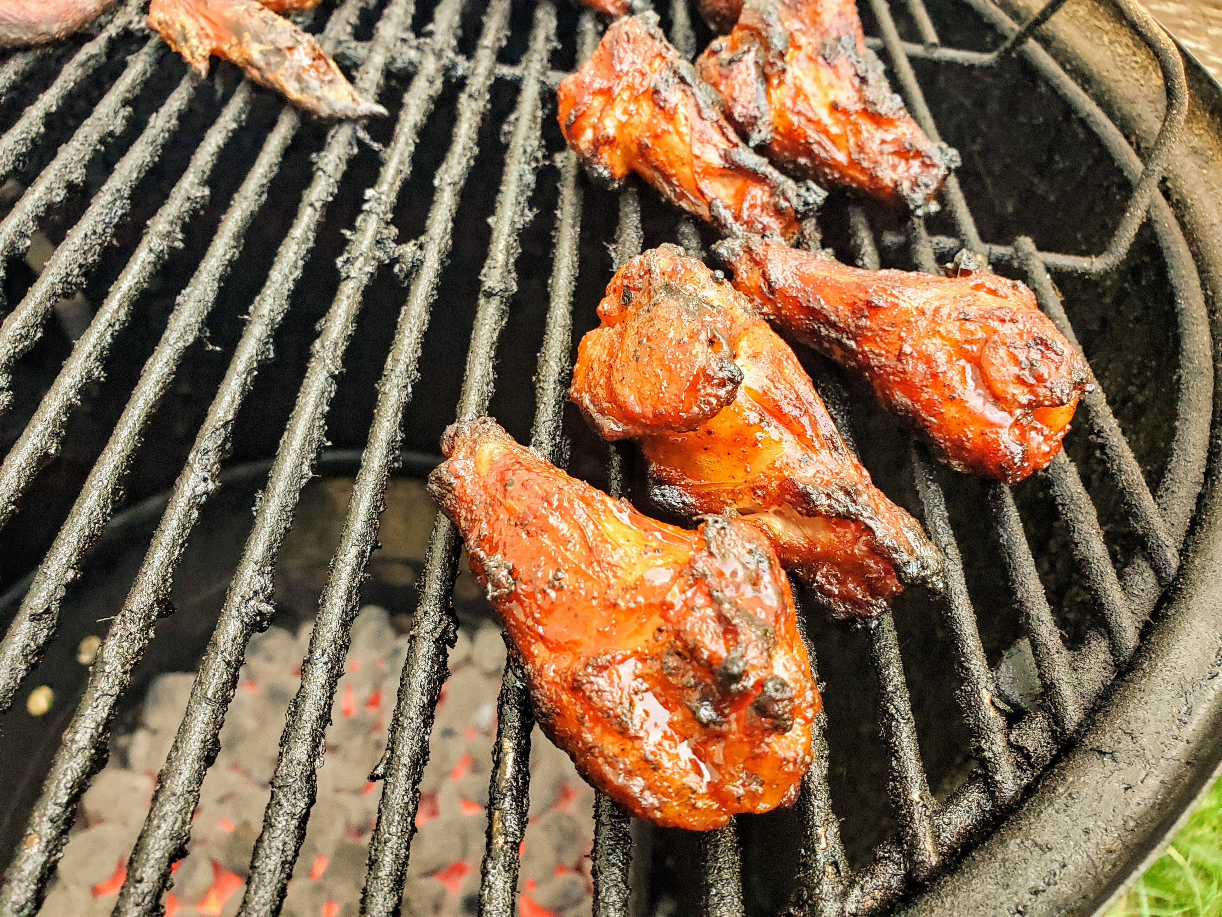 You can see they’ve started to take on a little color from the chicken-fat smoke, and we need to flip: