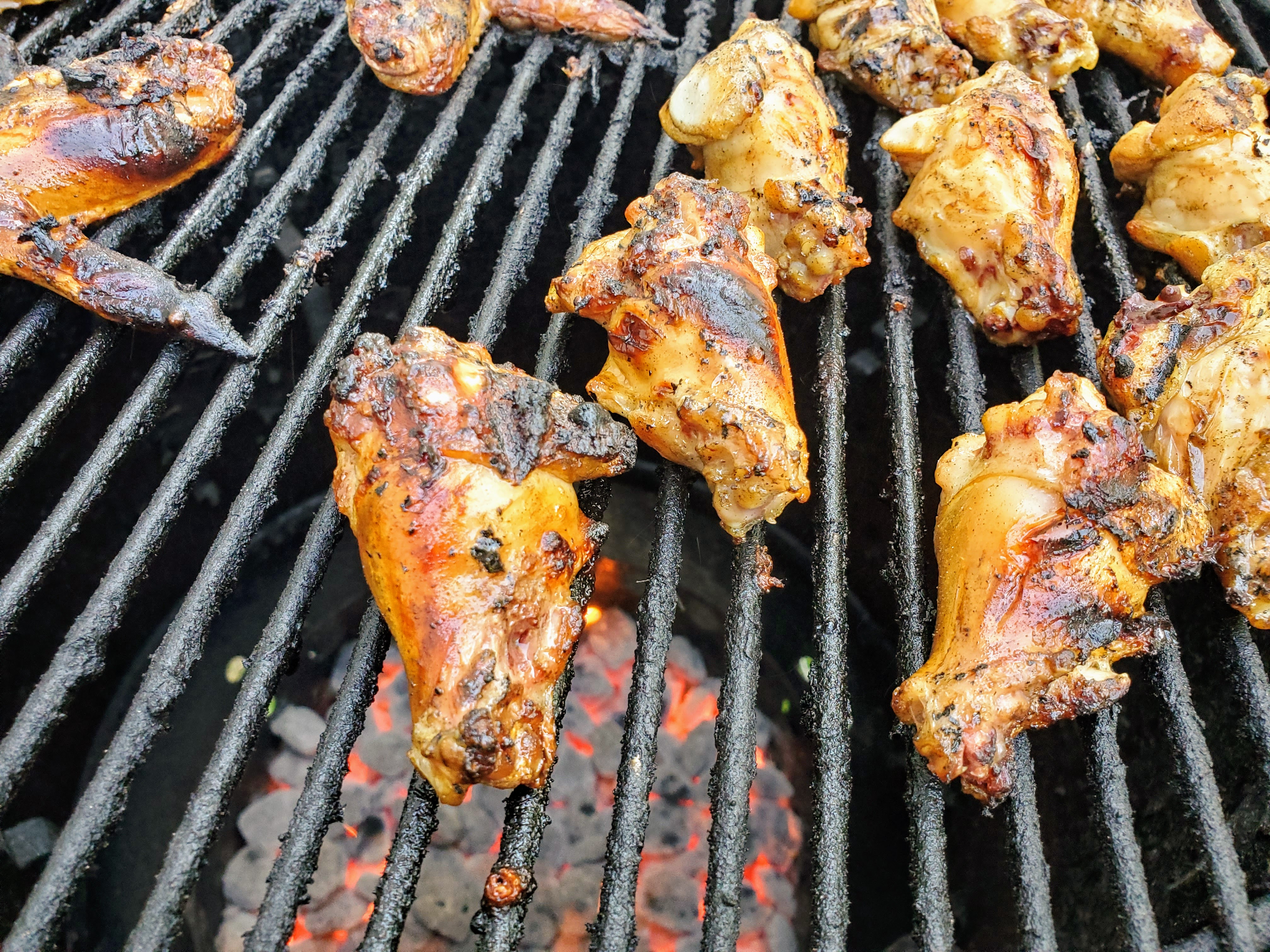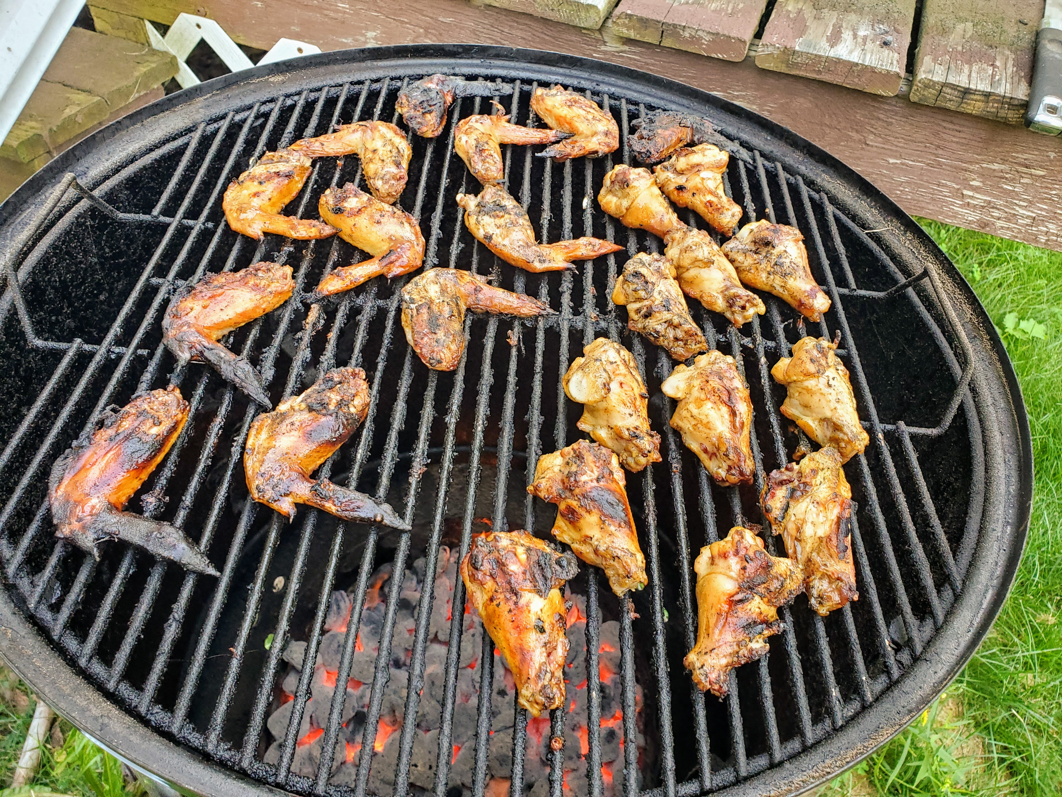 This is going to give us crispy skin, and although we aren’t using wood and we’re not cooking at “smoking temps,” the fat from these will render out, drip onto the hot coals, sizzle and flame and smoke back up, giving the chicken a flavor it can only get cooked over open fire. This is ALSO the second reason I leave the wingtips on the flats when cooking outside: they are a repository of fat and flavor that’s going to help season the whole shebang.