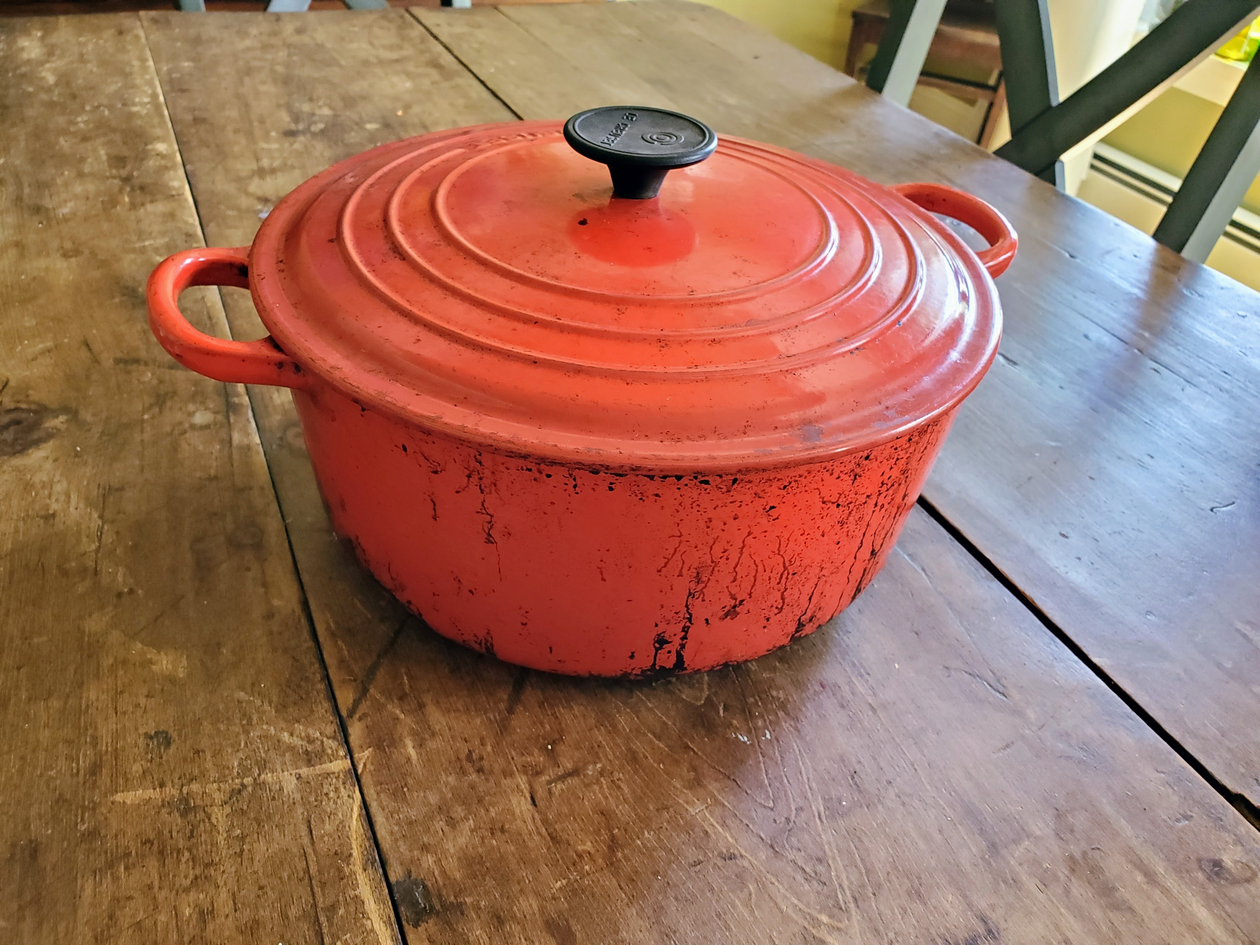 An enameled cast-iron dutch oven. Why does it look like hell? Because it’s been there and back, and delivered everything from Thai coconut curry to fried chicken to rustic loaves of bread along the way.