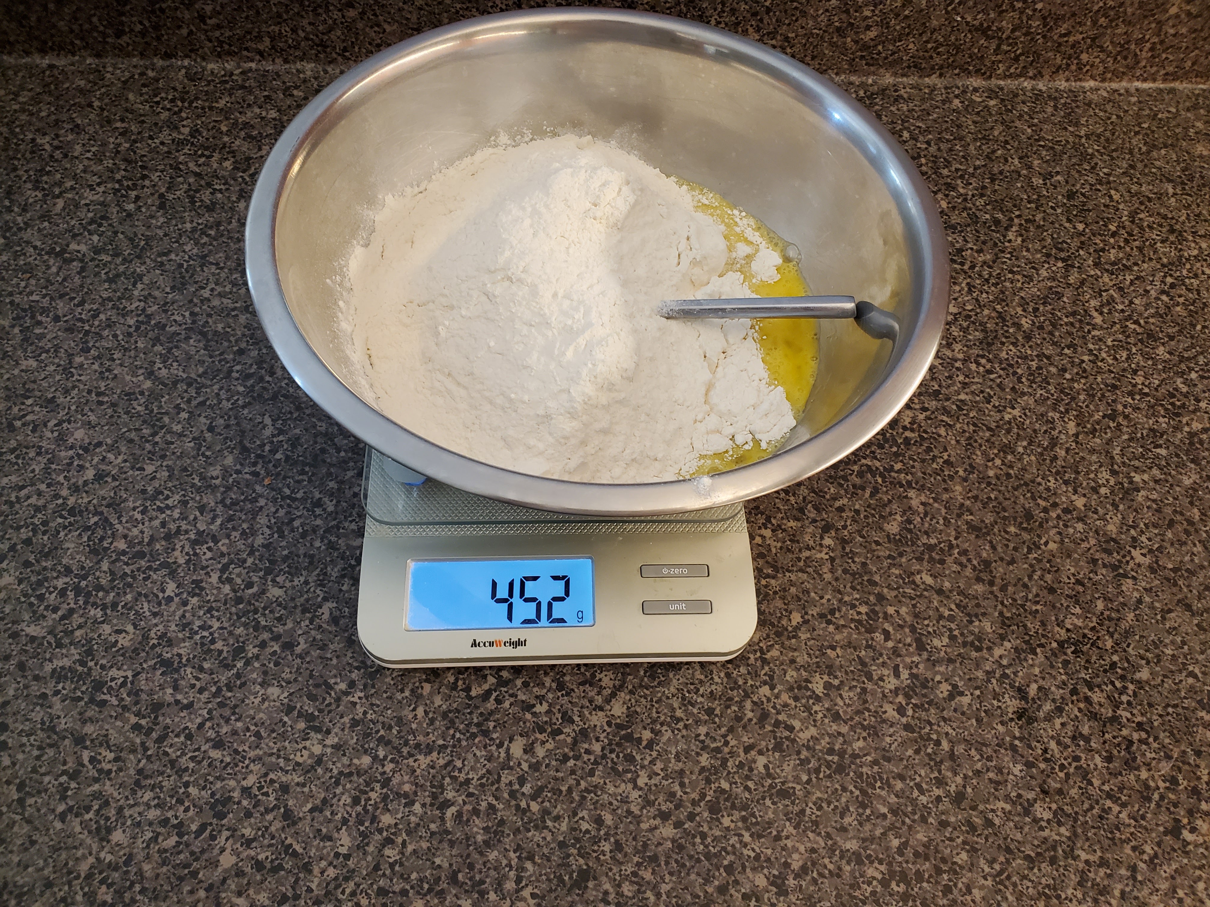 The magic ratio of pasta is 3:2 flour to eggs. The practical effect of this is that I weigh my eggs, then multiply by 1.5 to find the rough measure of flour I’ll need:
