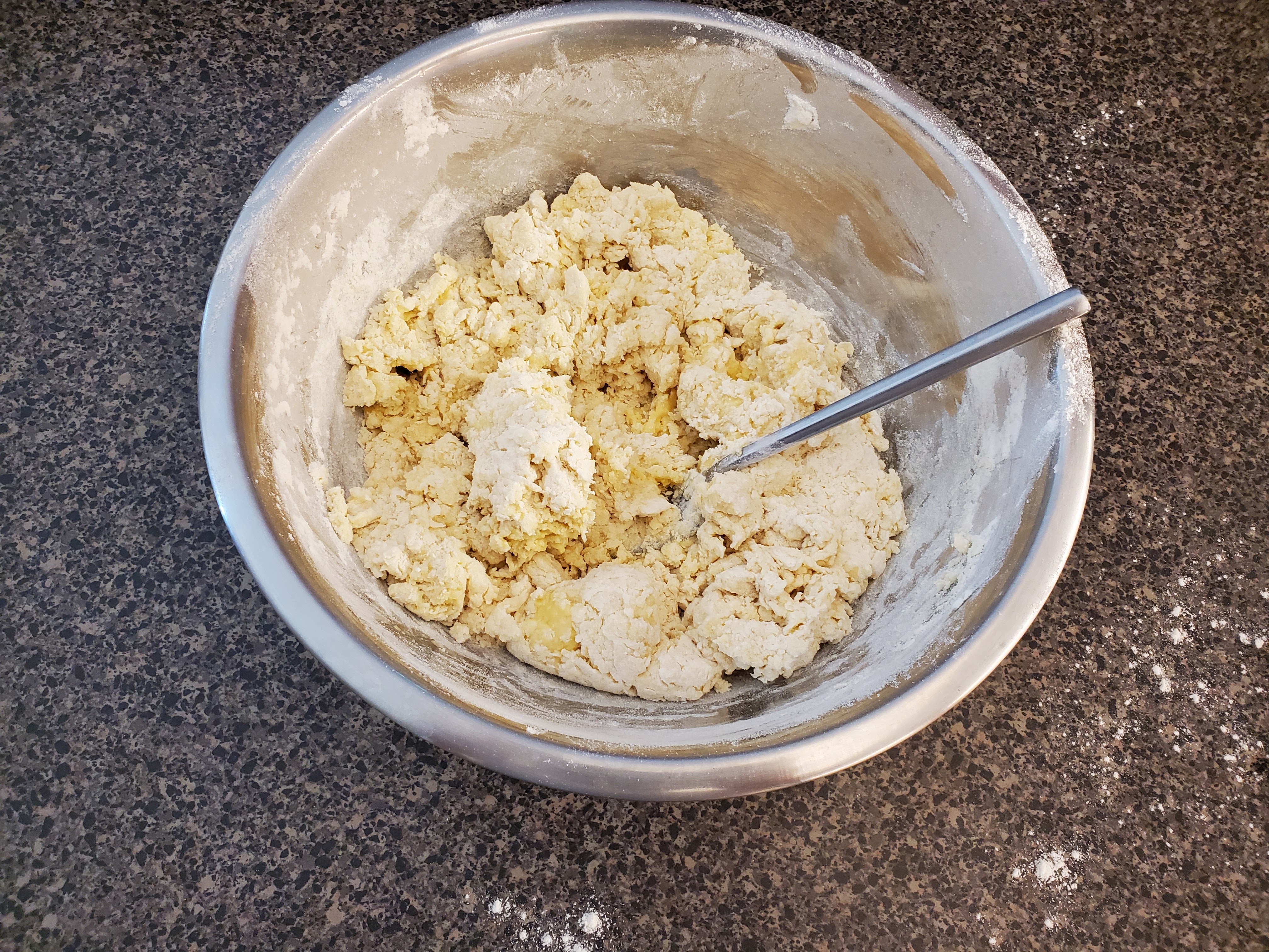 I like to use a fork at the front end to incorporate the eggs into the flour. It just seems to make less of a mess. Shortly, you’ll have a shaggy dough: