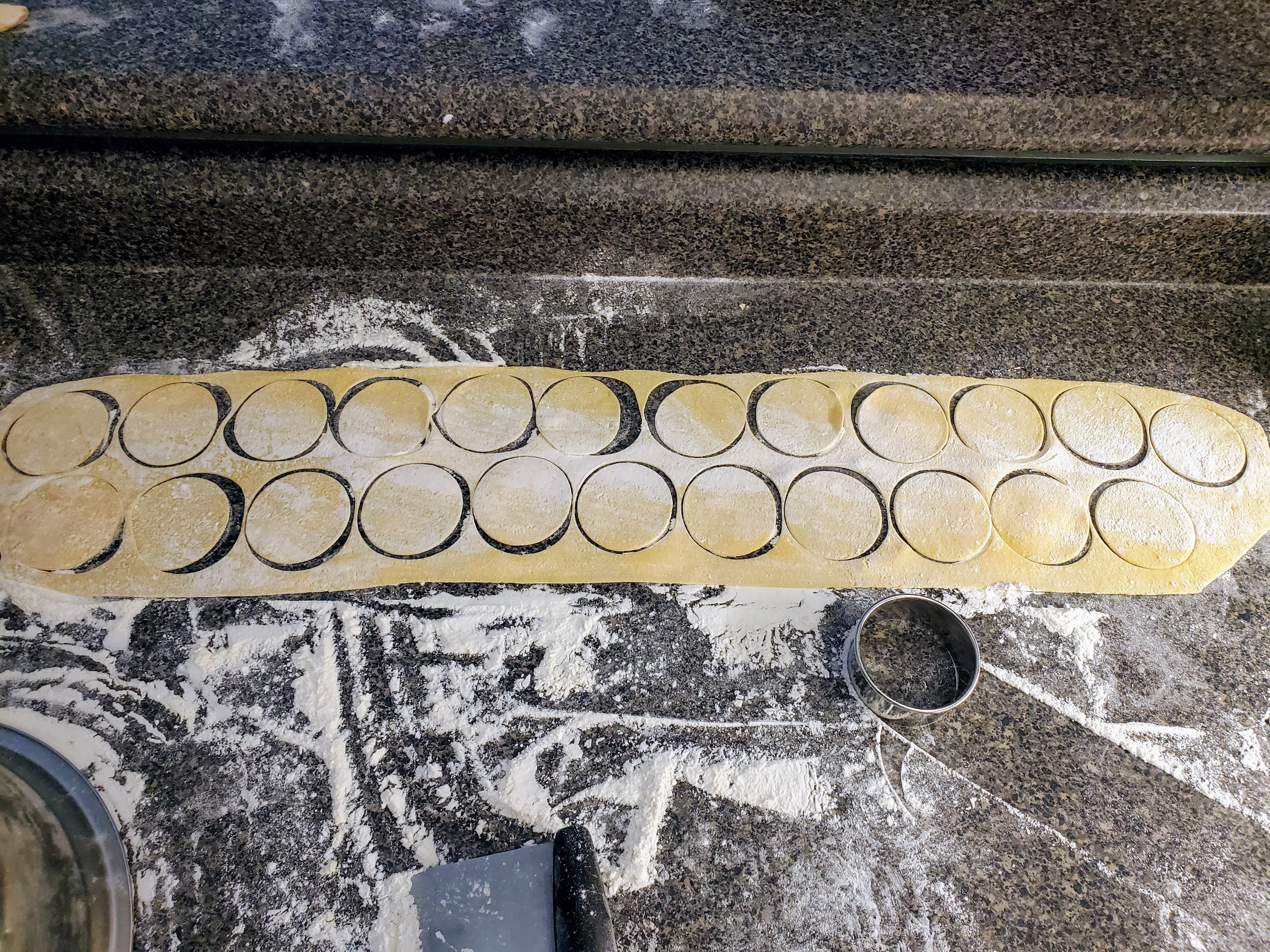 Step two: making the rounds. This is where I’m going to get a lot of hate from traditionalists, but it makes things easy. After running your dough through your pasta rollers (I like a #6 thickness), I cheat and use a pastry cutter to produce uniform rounds:
