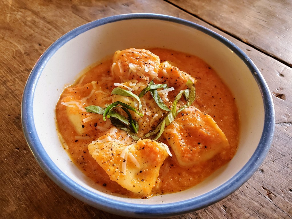 What? You didn’t make a sauce? Well, these are great with a little browned butter and sage. Or maybe some classic pesto. Tonight, we’re grabbing some of our standard “sauce of your own” from the freezer and heating it up with a little butter, a little cream, and some fresh parm for a scratch-made pink sauce: