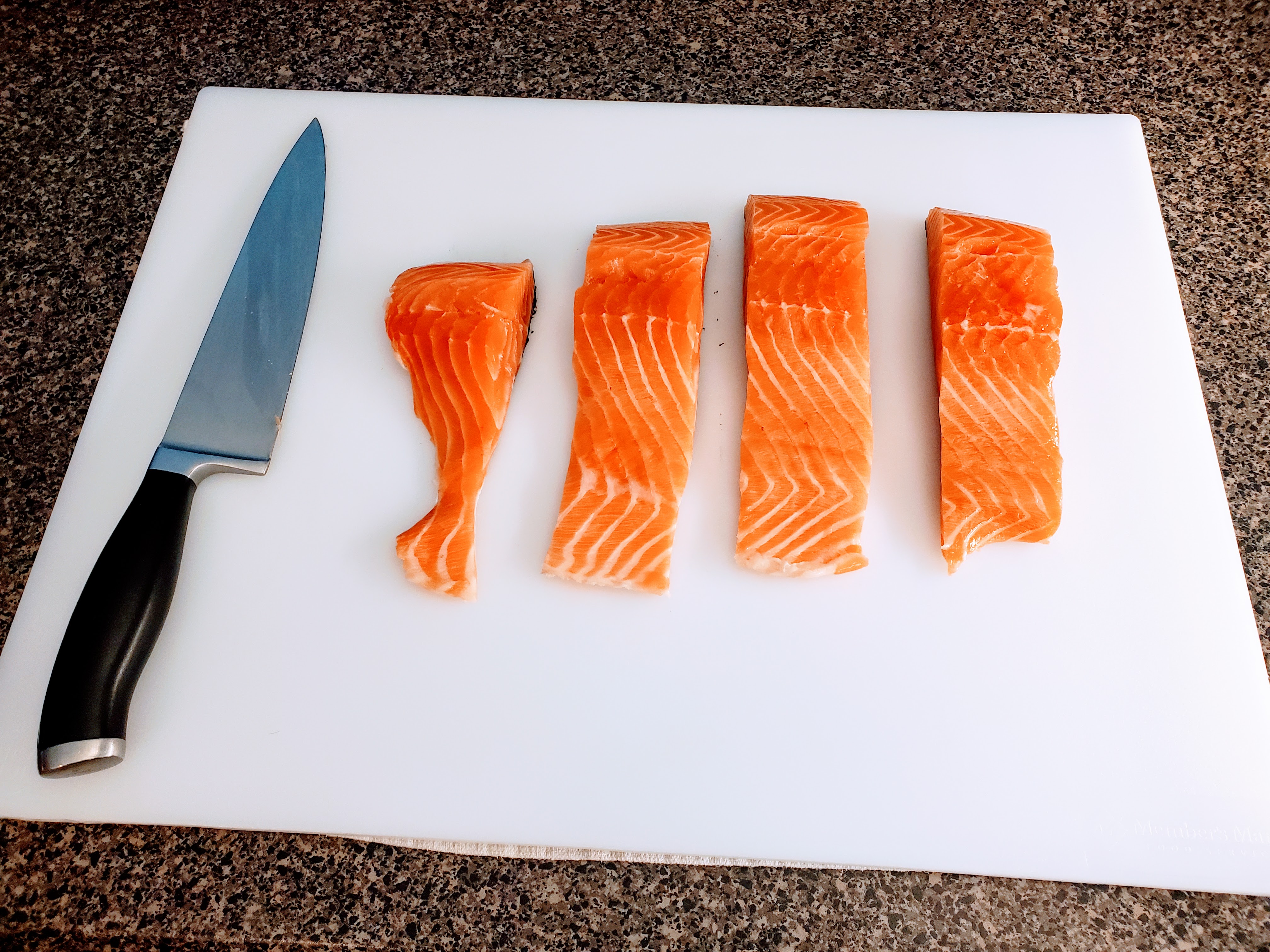 Anyway, we also try to avoid pre-cut fillets, and instead buy bigger hunks (like the one above) or even whole sides, if we can get them (using a vacuum sealer and freezing produces almost no loss in quality, so we buy in bulk if we can).