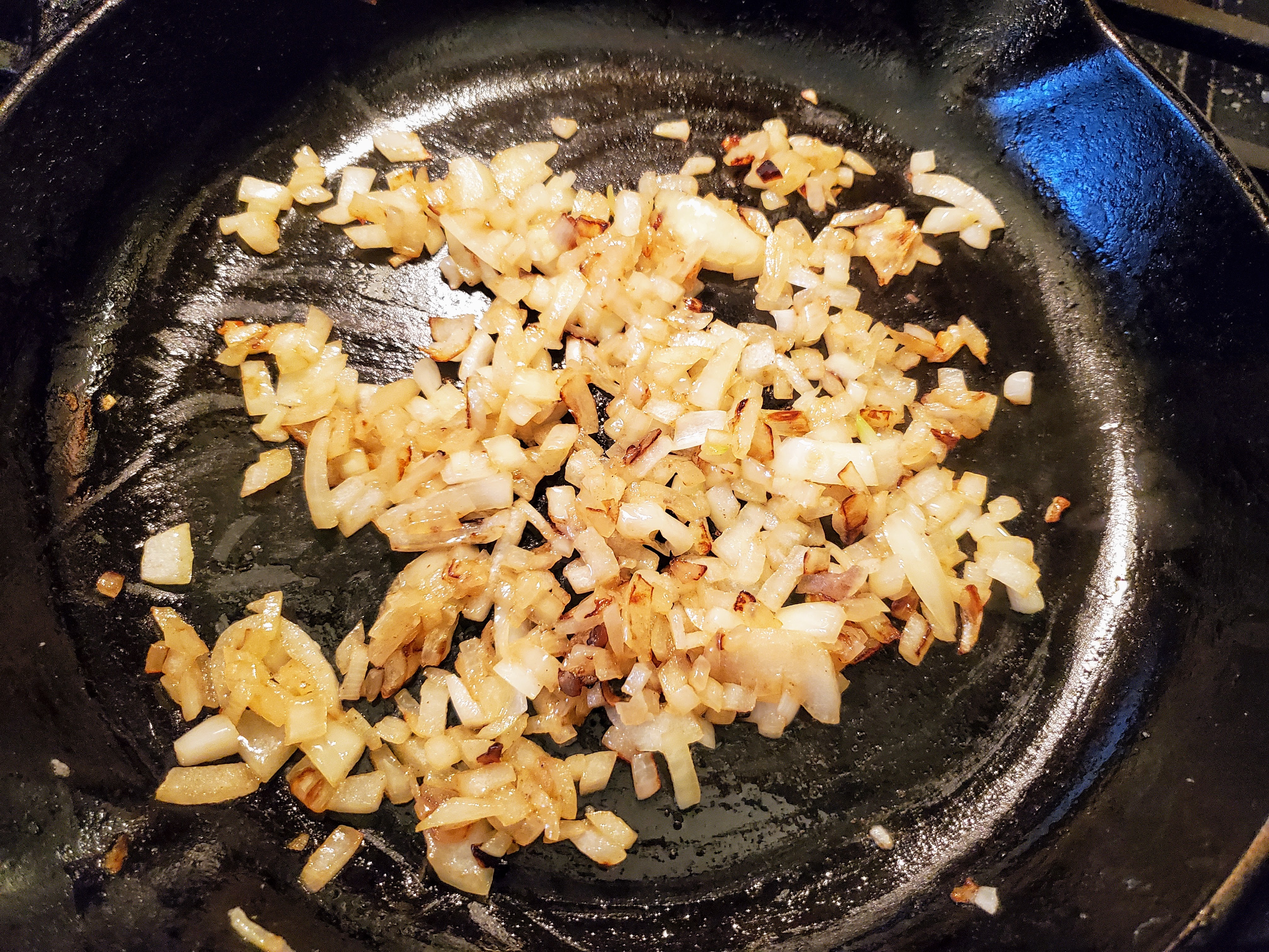 Throw it in the pan with the butter over medium heat, with a little salt, and saute until nicely browned. Note: this is not a “sweat.” You want higher heat here, and it should look like this: