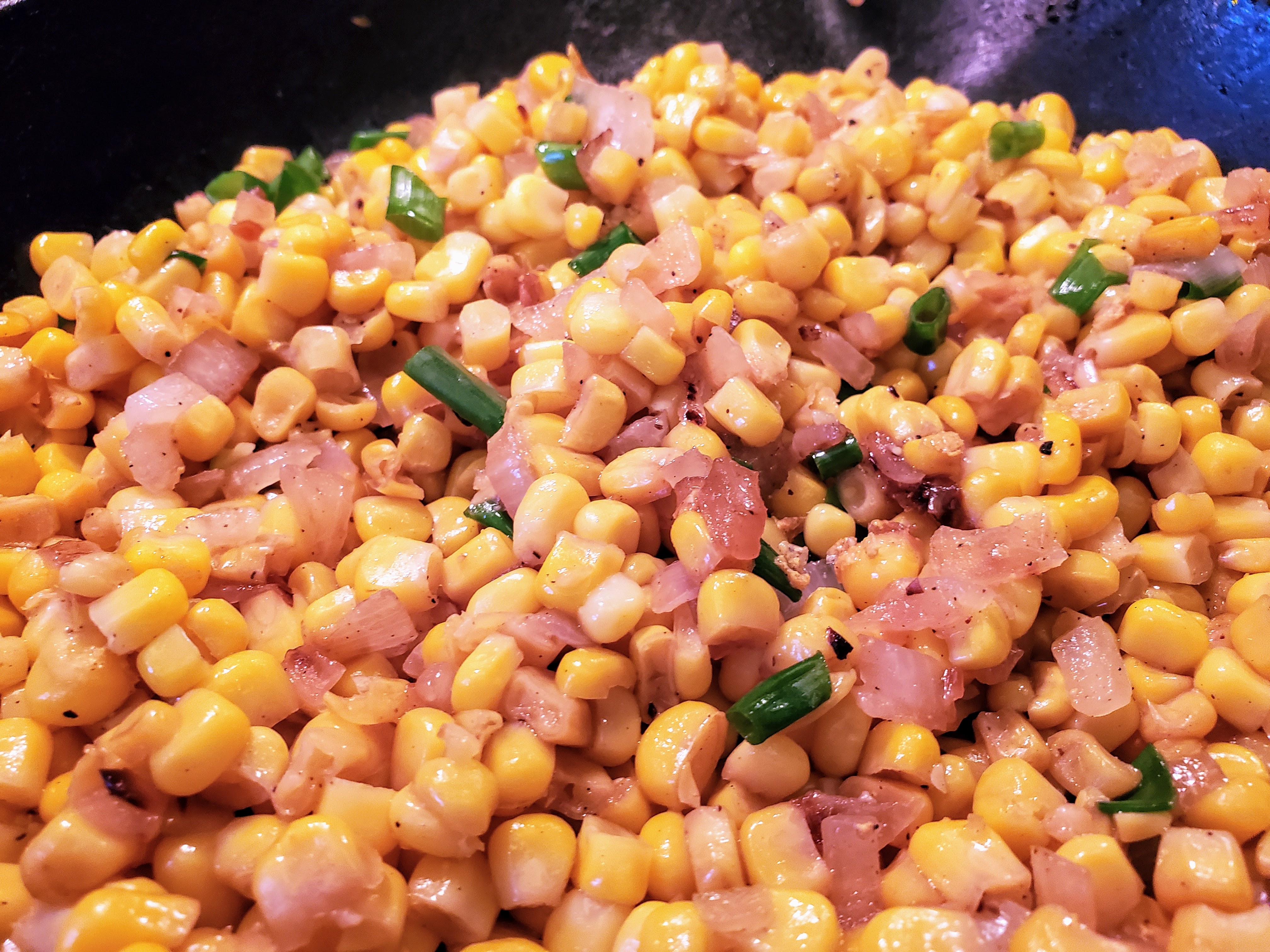 Nothing burned, but everything has some color. From here, add the corn and boost the heat to high.