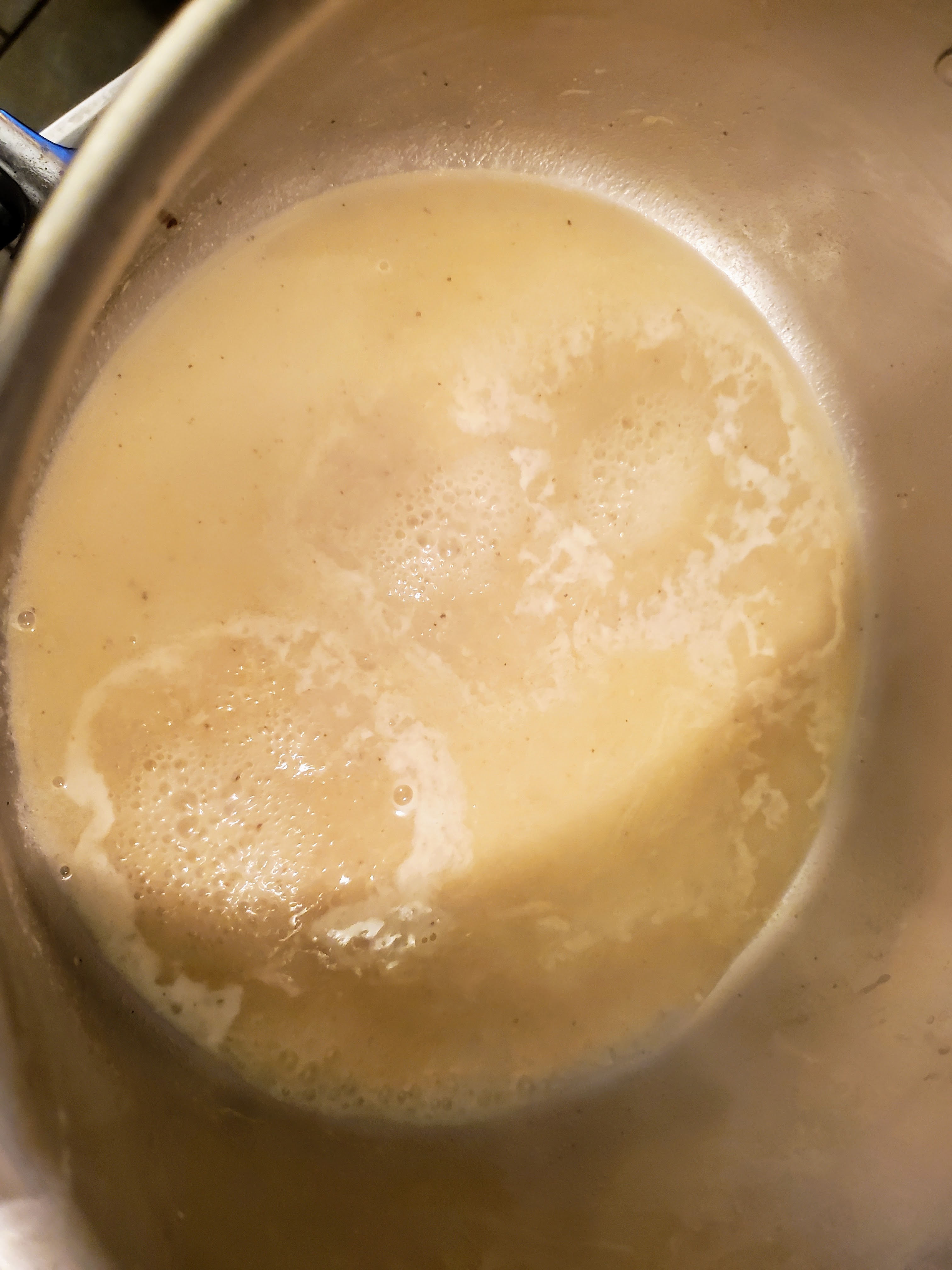 To that, add the butter and incorporate over low heat. Add lemon zest and juice, garlic powder, salt, and black pepper, and bring to a simmer. It should look pretty thin, like this: