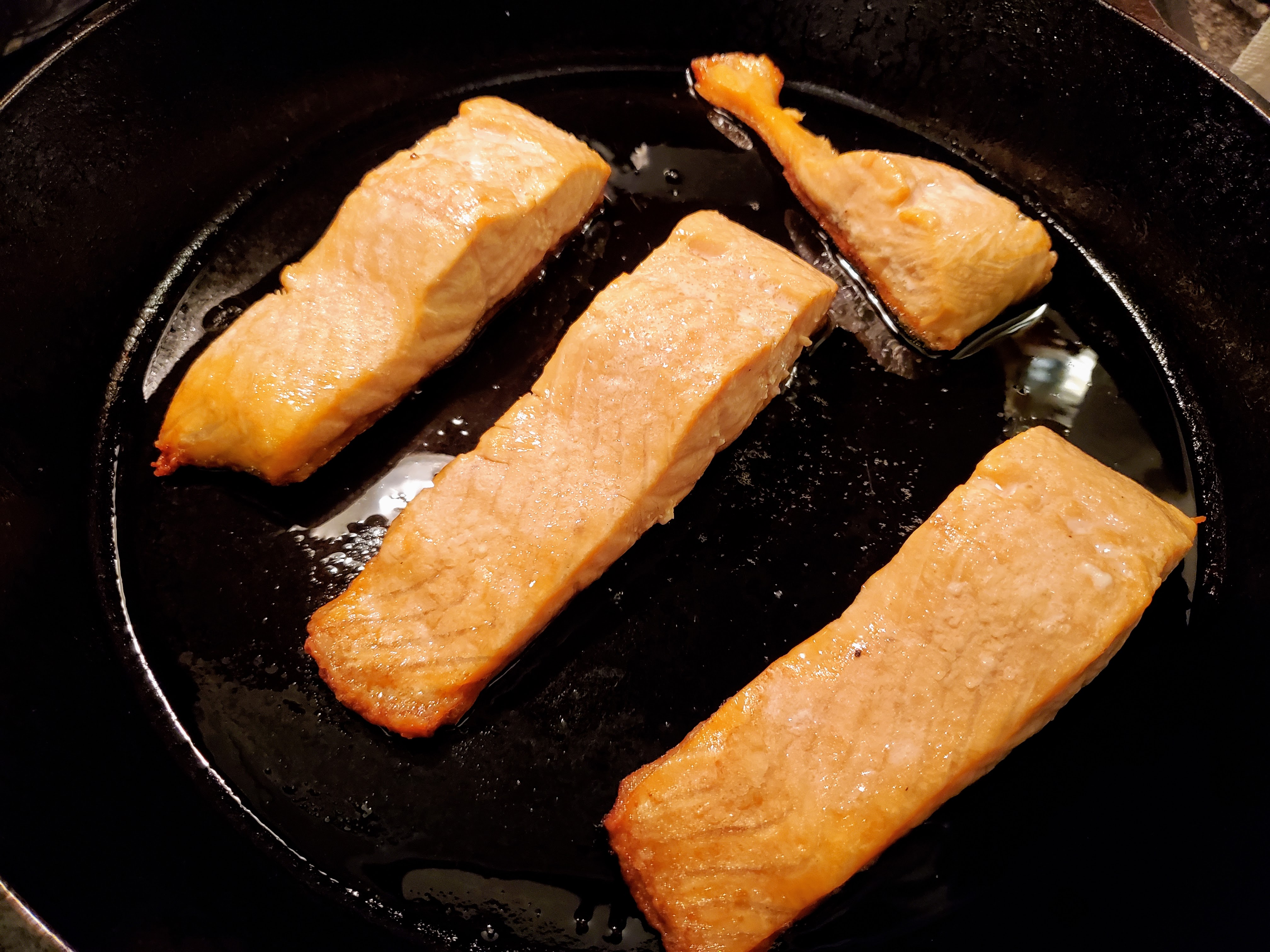 It’s going to sizzle and pop and spit a bit, so fair warning. The fillets will also contract a bit when they hit the heat, so don’t freak out. It’s not the zombie Sal-Man. At least, not yet, but I’ve said too much.