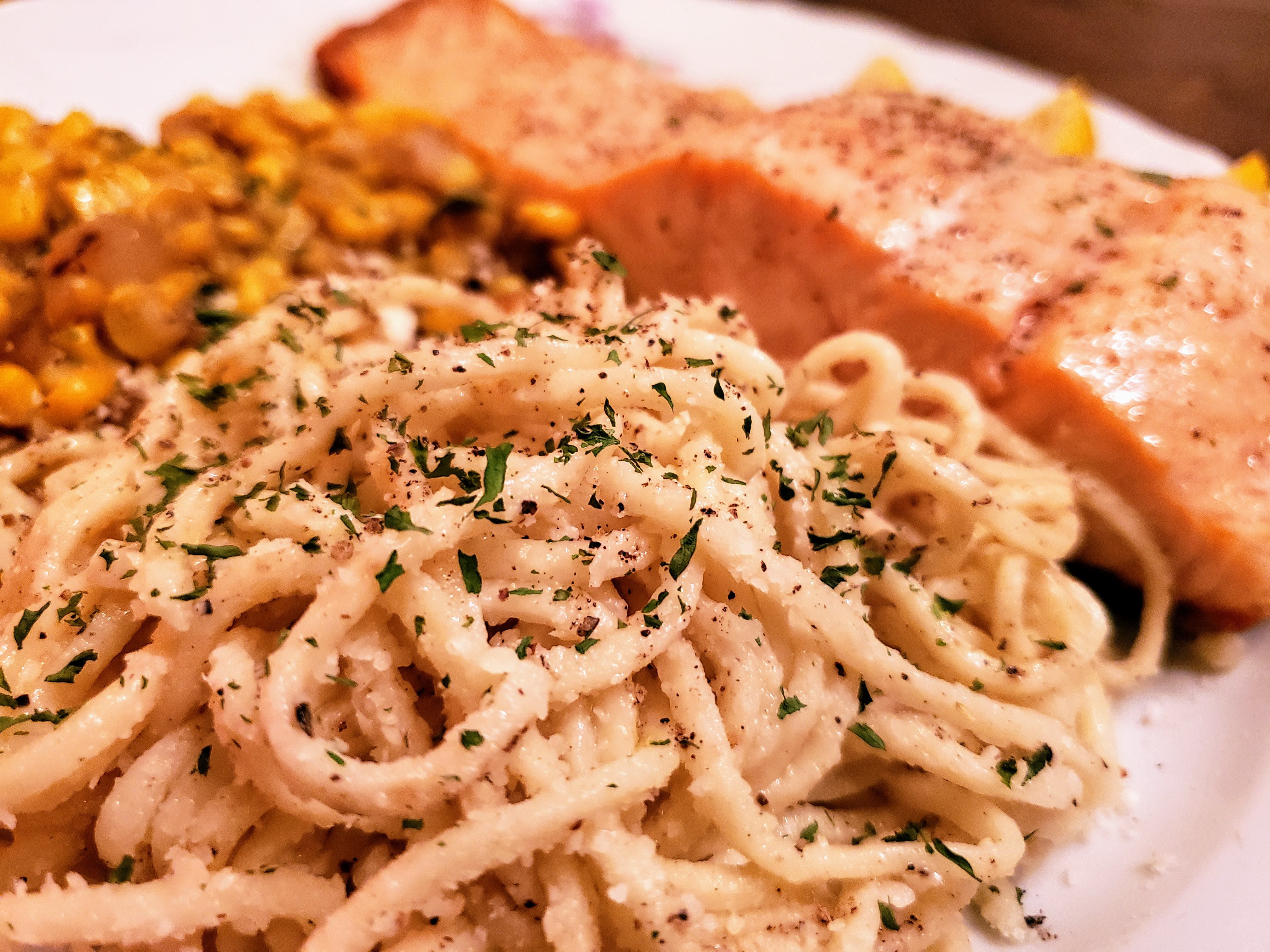 The salty fishy goodness of the salmon, with the acidity from the lemon, meld with the round and sweet carnalized-onion corn and garlic pasta to produce a plate that works together better than Abbot and Costello. Our first complete meal, and our first born.