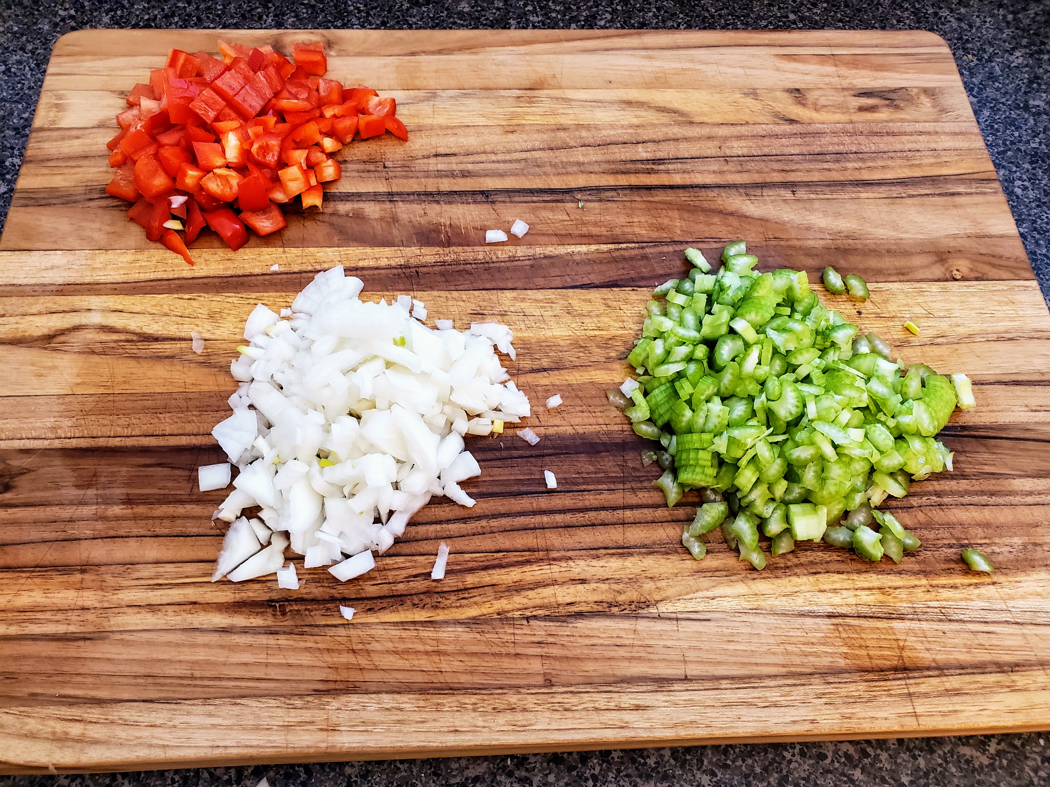 Step three: The Holy Trinity and the Roux. Dice the onion, celery, and pepper into uniform(ish) cuts: