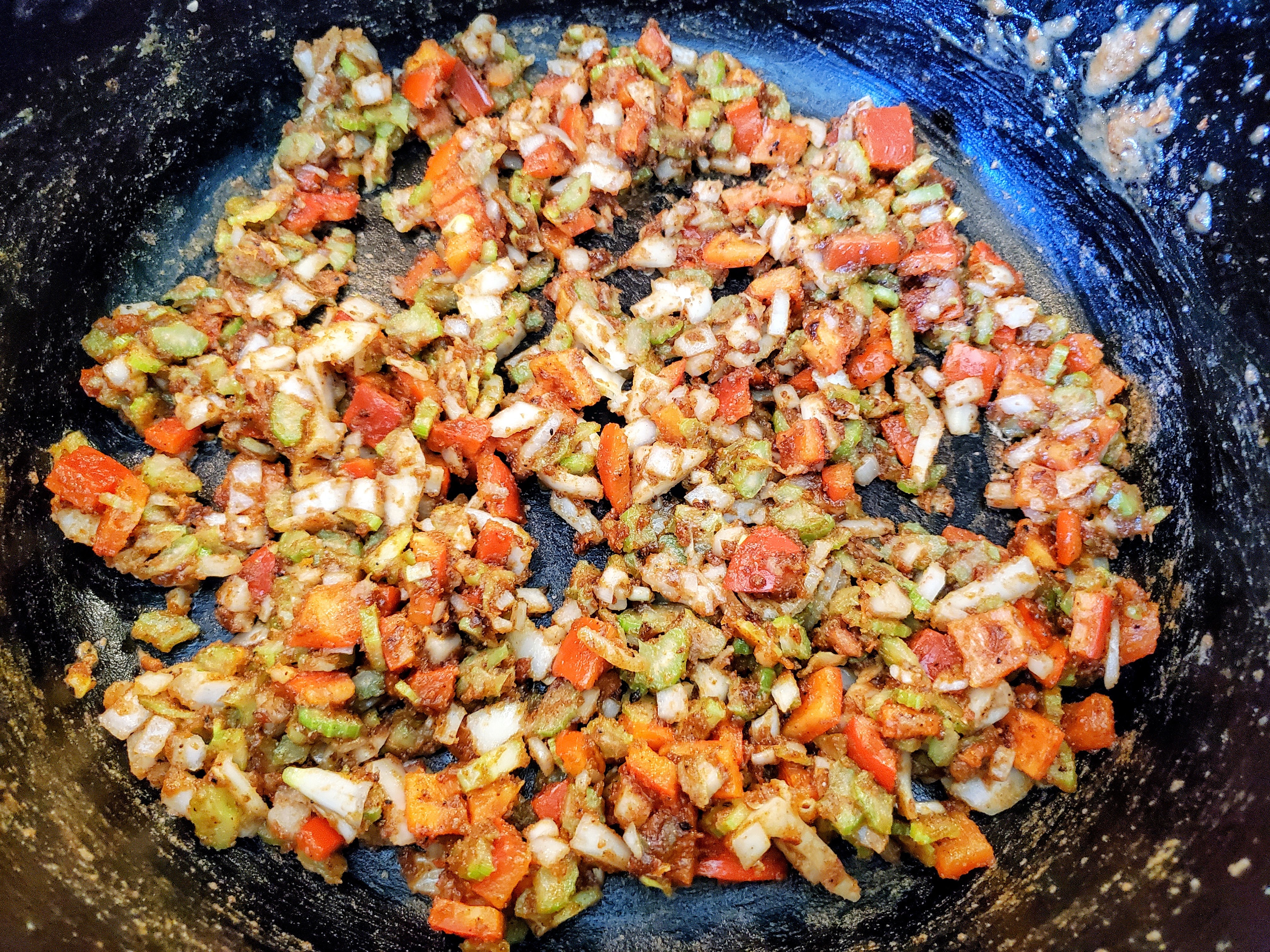 Once your roux is brick, kill the the heat, add the trinity, and stir until incorporated: