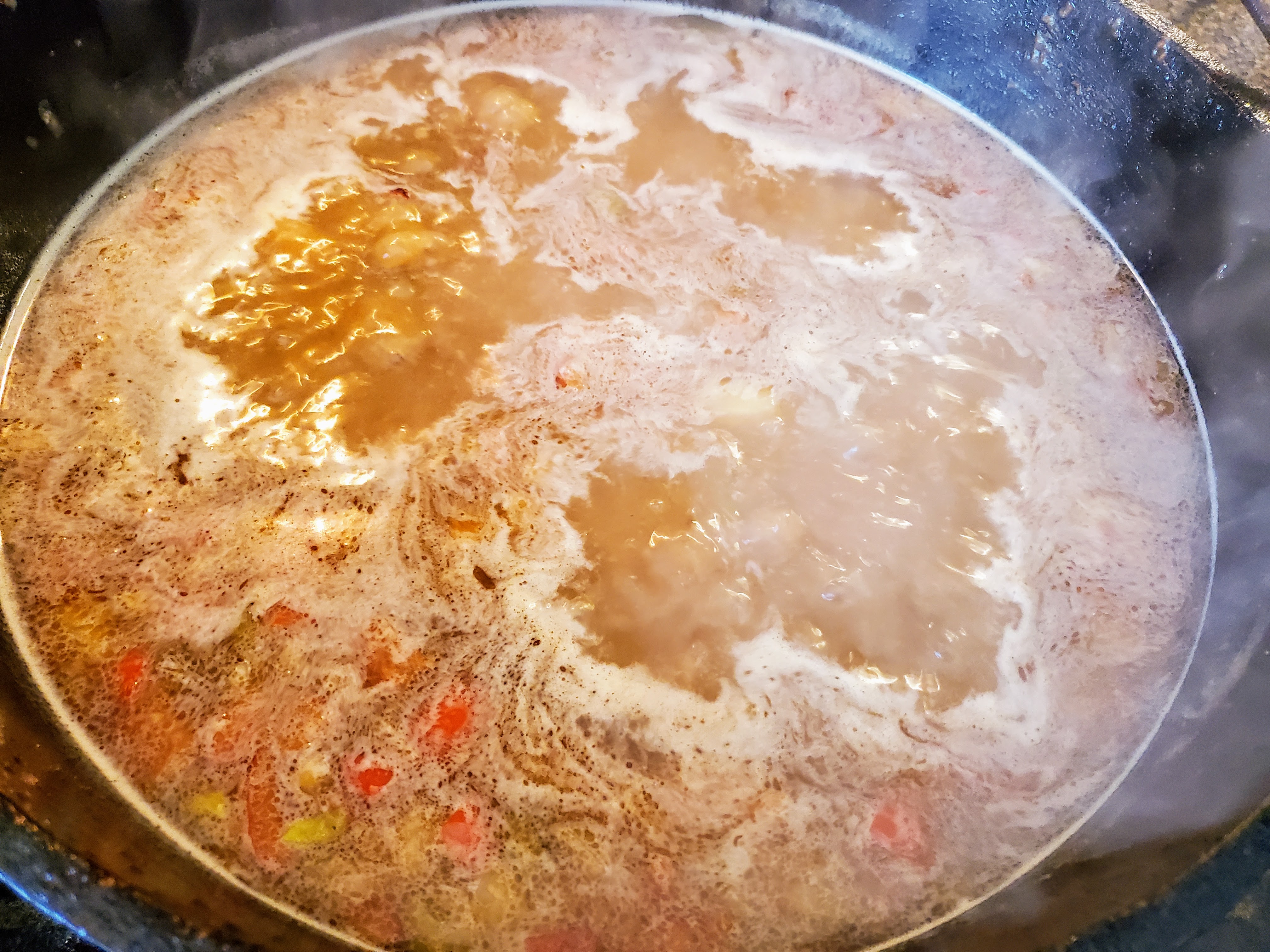 You may also note we haven’t added a single grain of salt or granule of cayenne (the only two real seasonings in this recipe). Well, here’s the thing: this is going to change a LOT while it cooks. It’ll thicken, and reduce, and meld, and marry. Just let it happen, and we’ll season when it’s a little older. Besides, there’s salt in that sausage anyway.