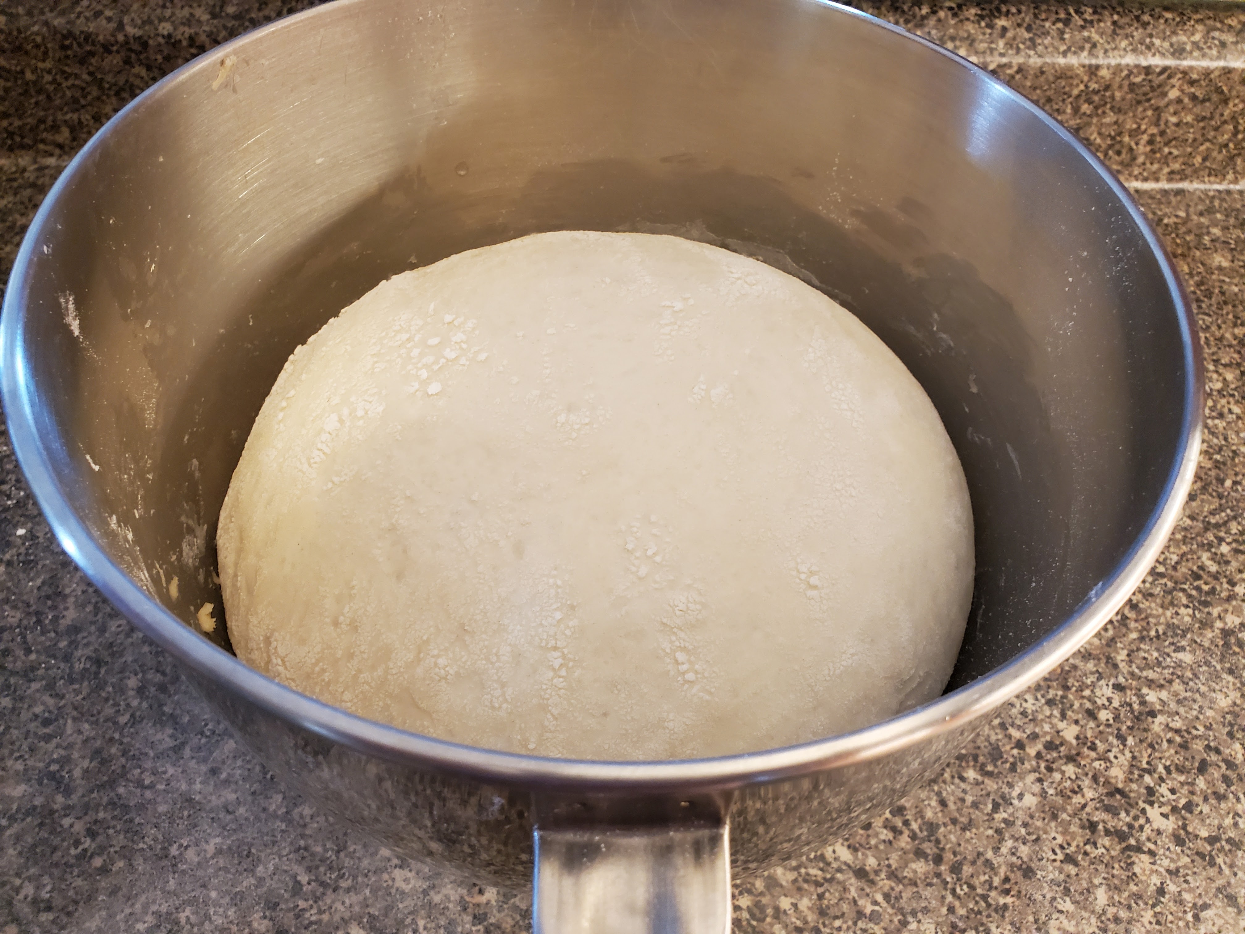 Slap this in a bowl, cover with a tea towel, and go do something else for a bit. After two hours, you should have a well-risen dough ball: