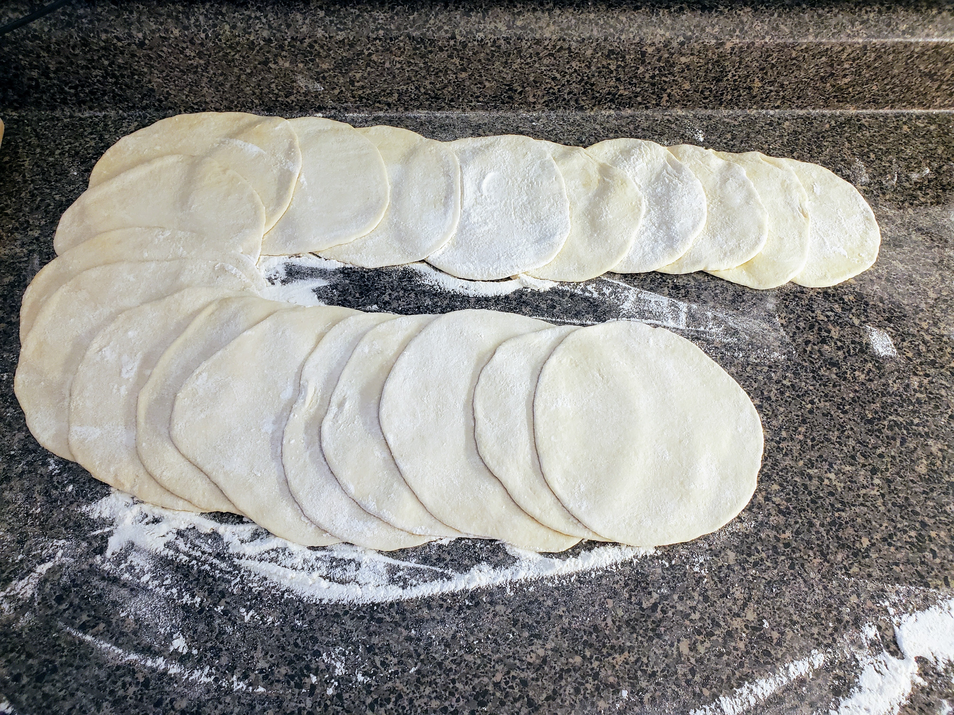 Roll out all of them in sequence, but keep track of which you’ve done first. These need to rest a bit, but by the time you’ve done the last of them the first will be ready to cook. I lay them out like this to help remember: