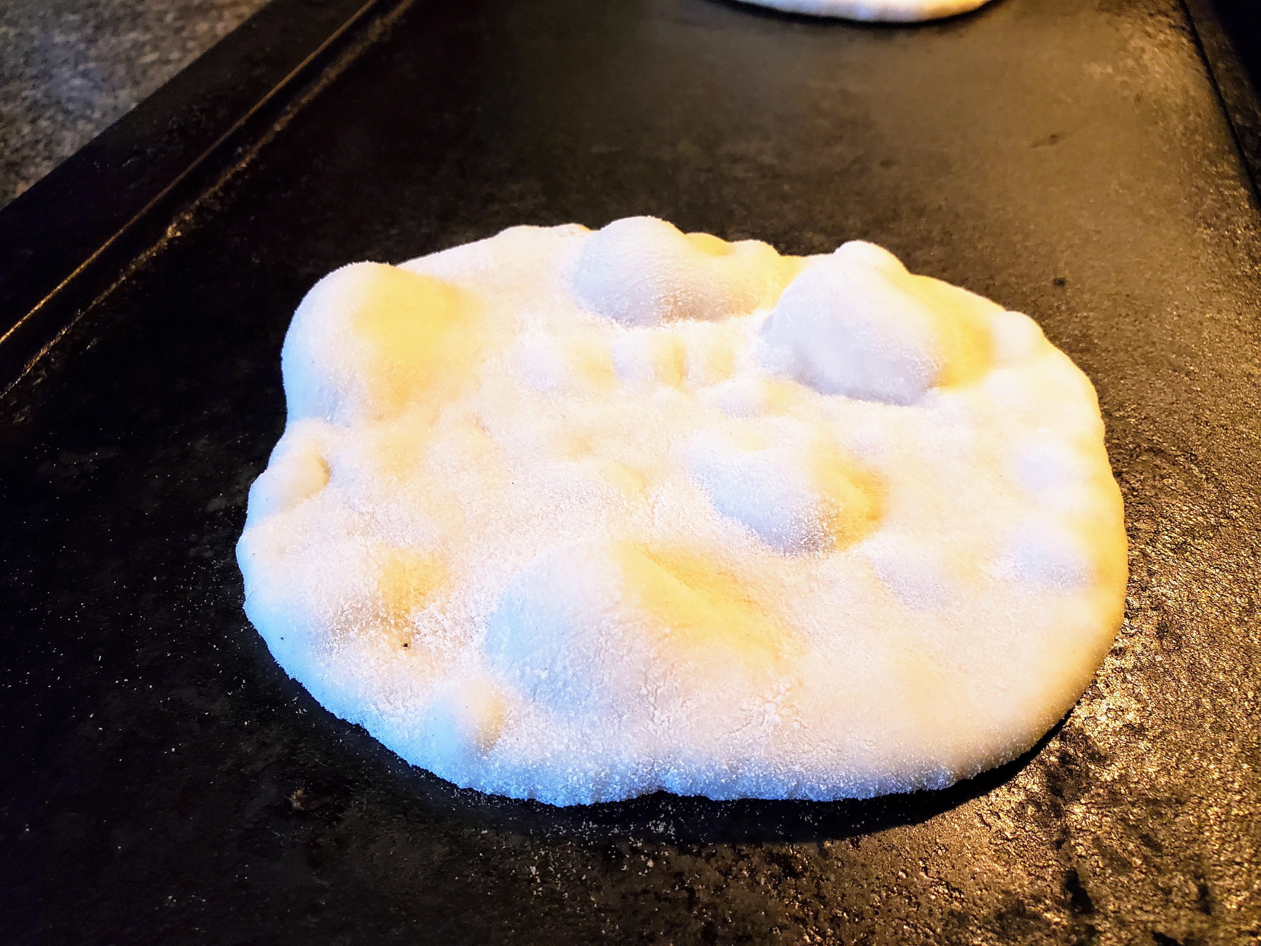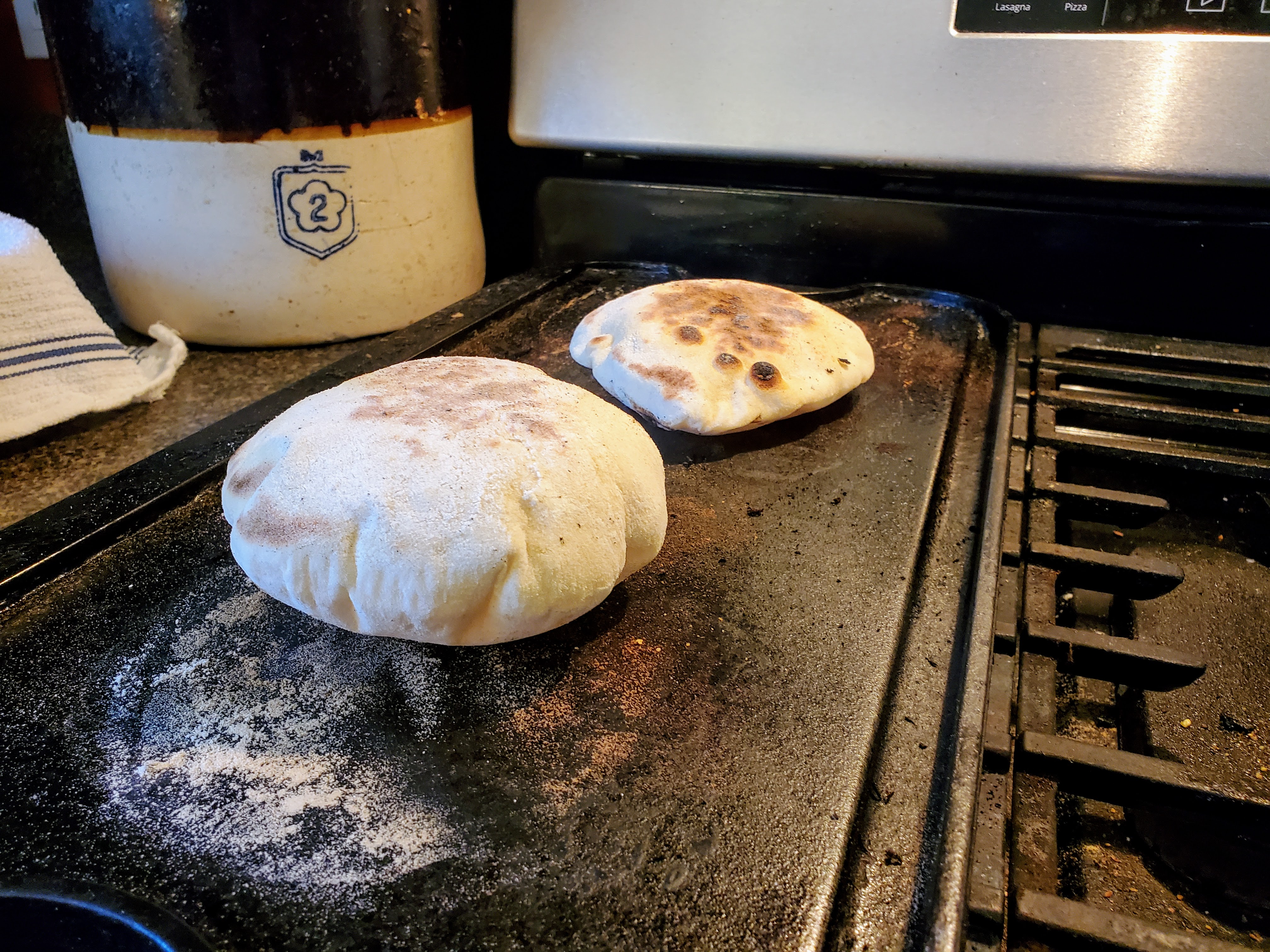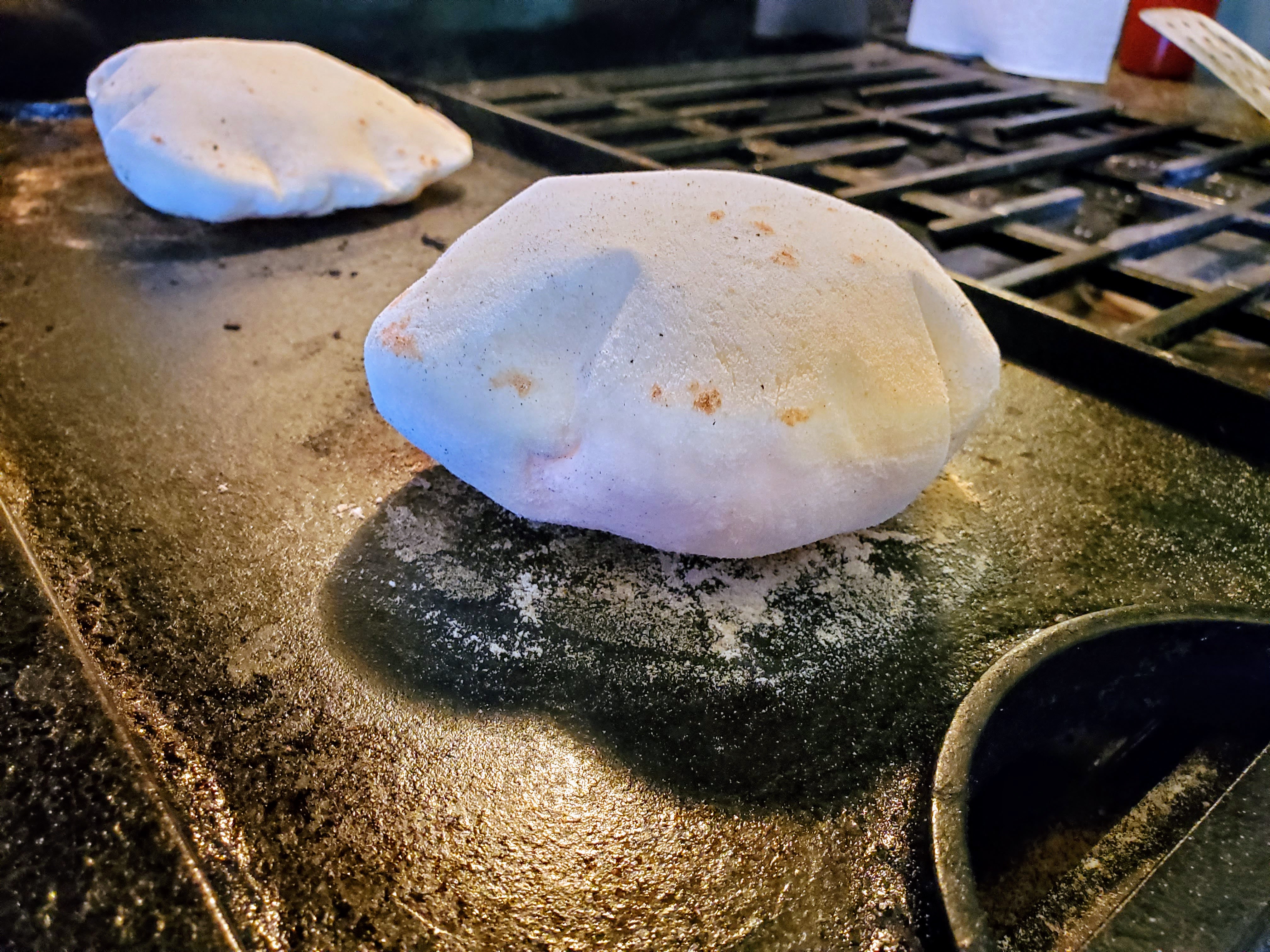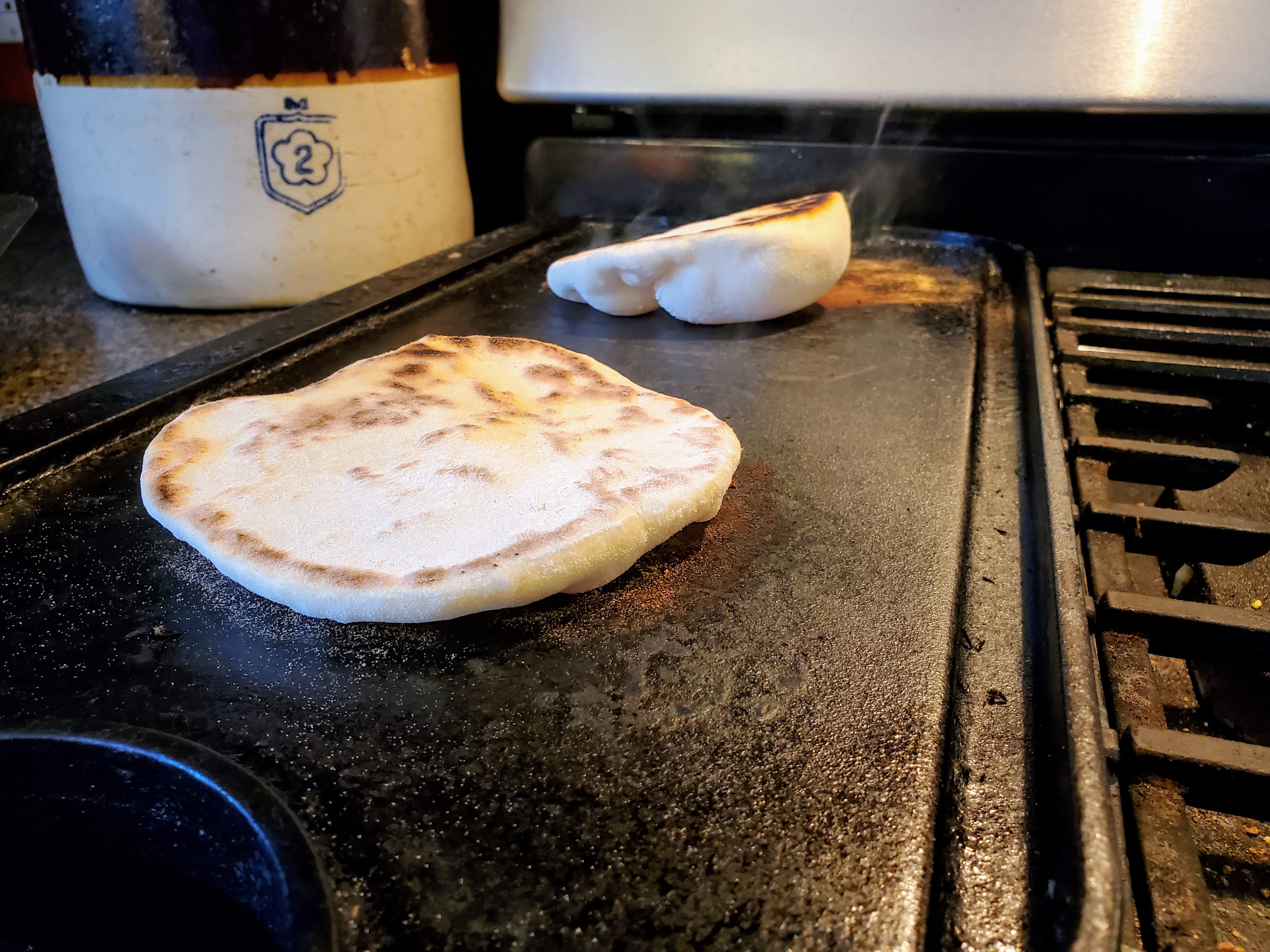 Step three: puff party. Get an ungreased skillet over medium-low heat. I like my cast iron griddle, but a regular skillet would work as well. Down go the first two pitas we rolled out: