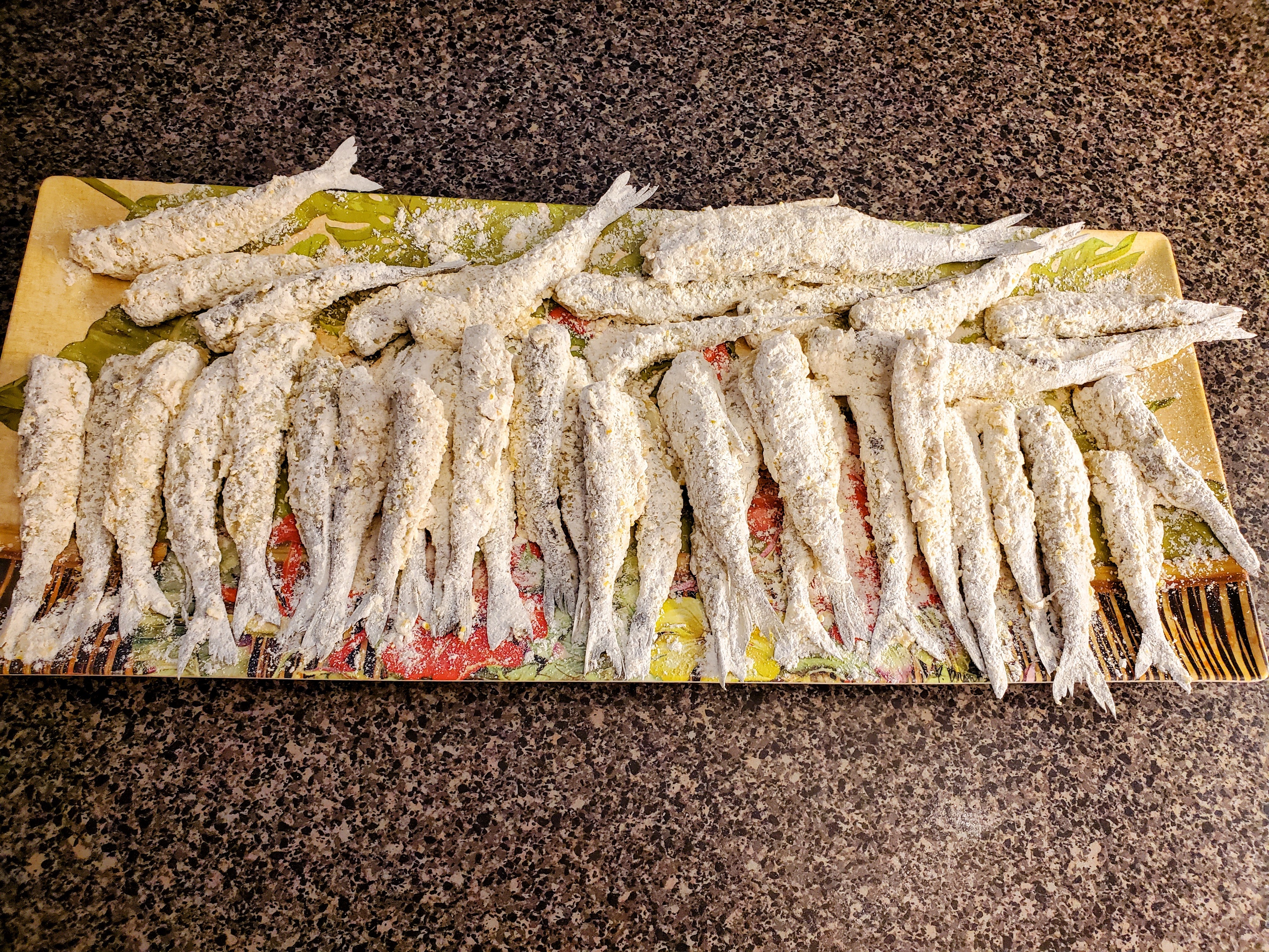 Start from the left, work to the right, and put your breaded smelts on a tray: