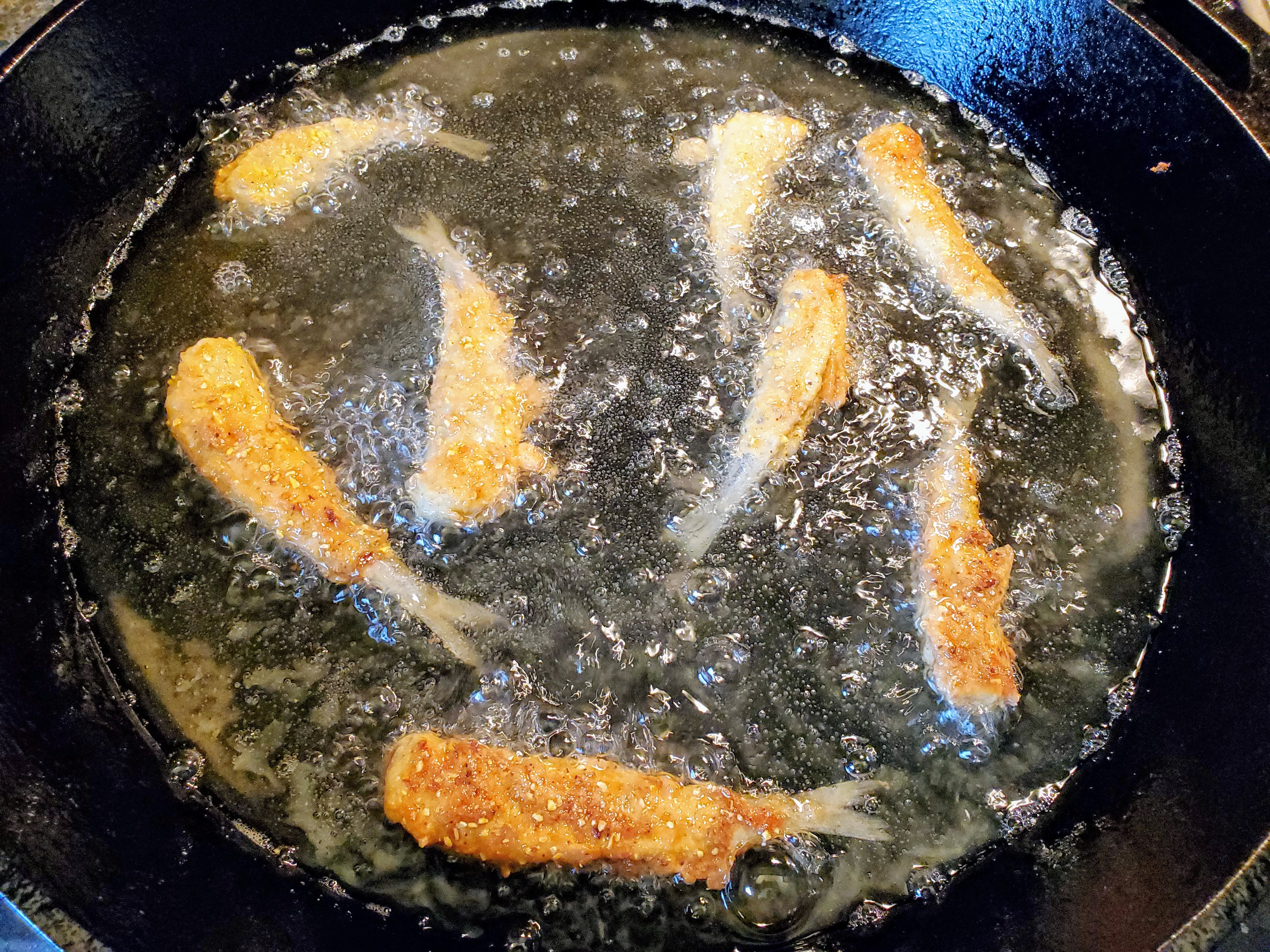 The big trick here is to watch your oil temps because it will want to get too hot. Just ride the controls to make sure everything is having a nice, relaxing time. They should only take a two (2) to three (3) minutes per side to brown and cook, so use that as your guide. Taking longer, bump the heat. Happening too fast, drop it down.