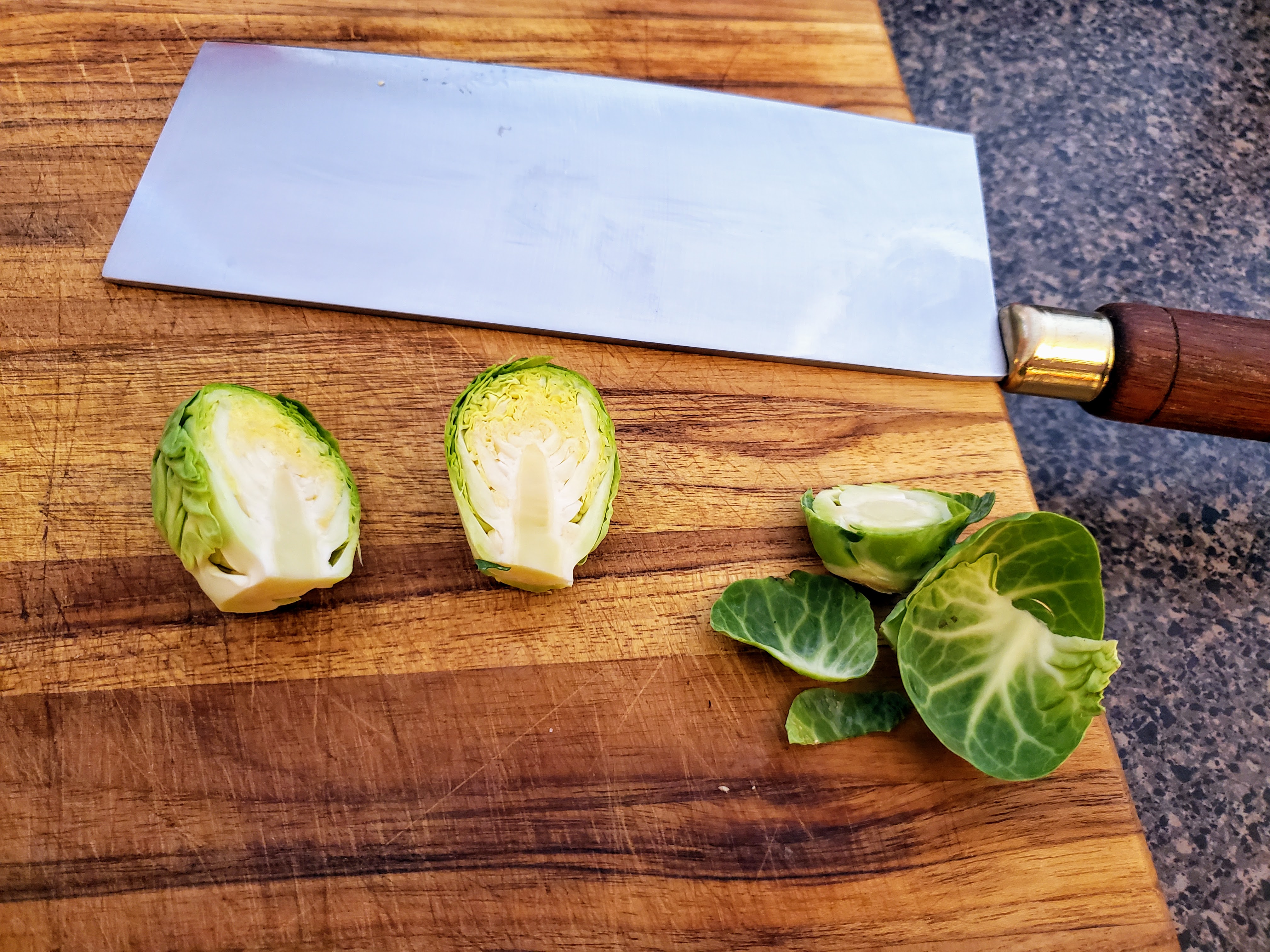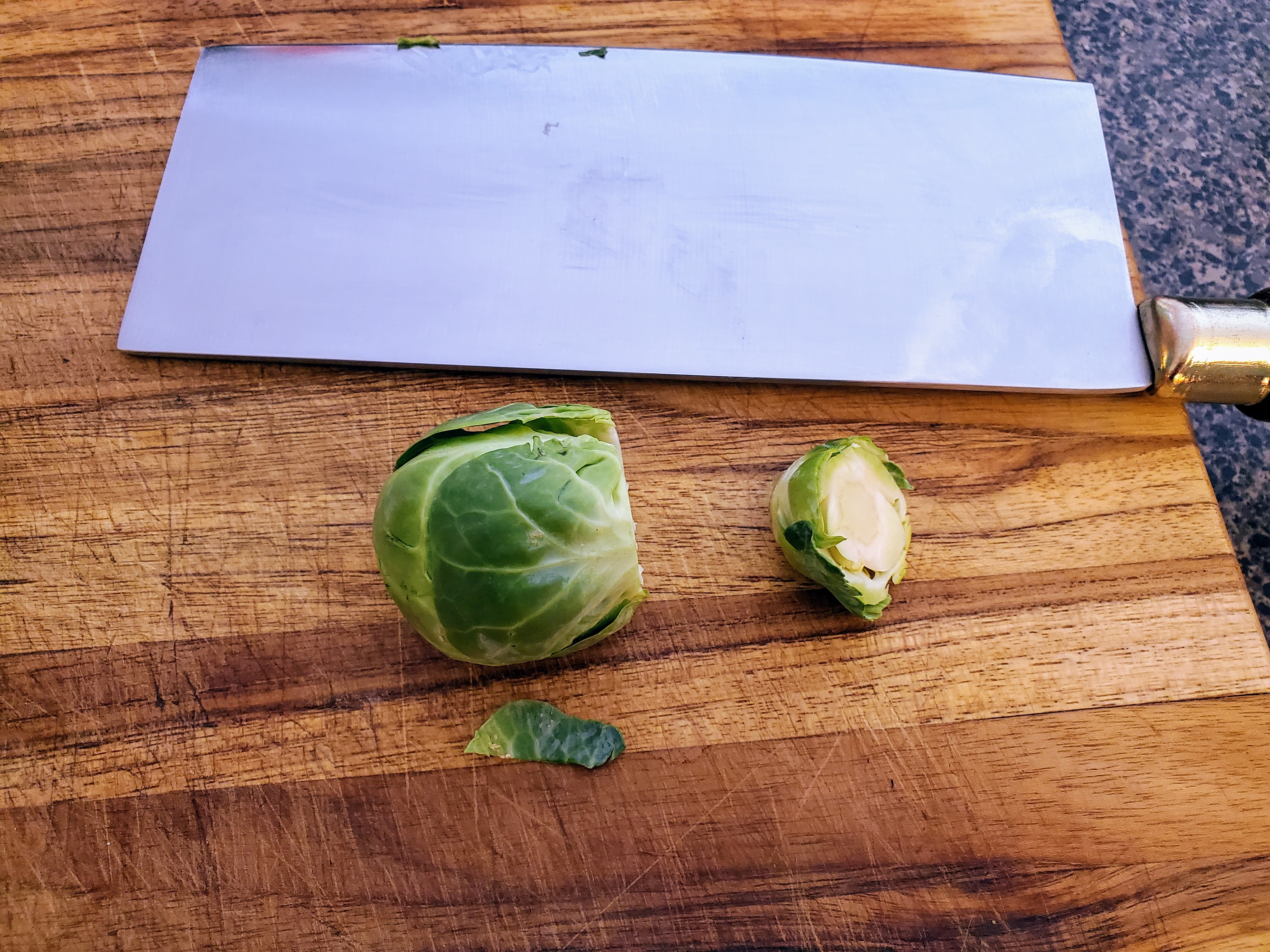 At this point, a few outer leaves will probably fall off, and that’s fine, but don’t be in a big rush to start peeling away at them. When I first started out on my sprout voyage, I’d read somewhere to “pull any leaves that come away freely.” Well, guess what? That’s the whole damn sprout. I remember staring, befuddled, at a cutting board heaped high with sprout leaves, thinking “Hmmm, this can’t be right.” Just be gentile, and try to keep it as intact as possible, and split it in half: