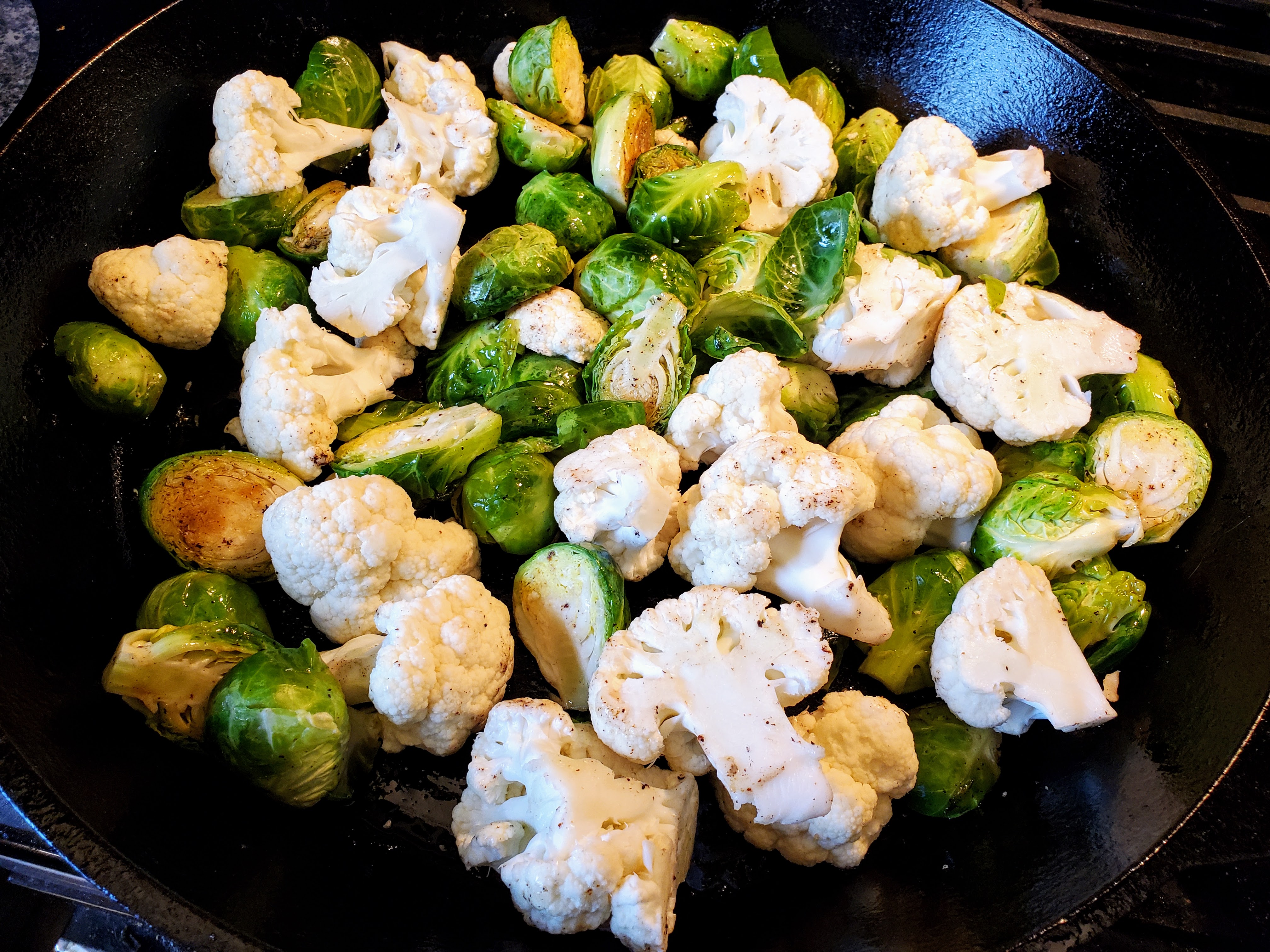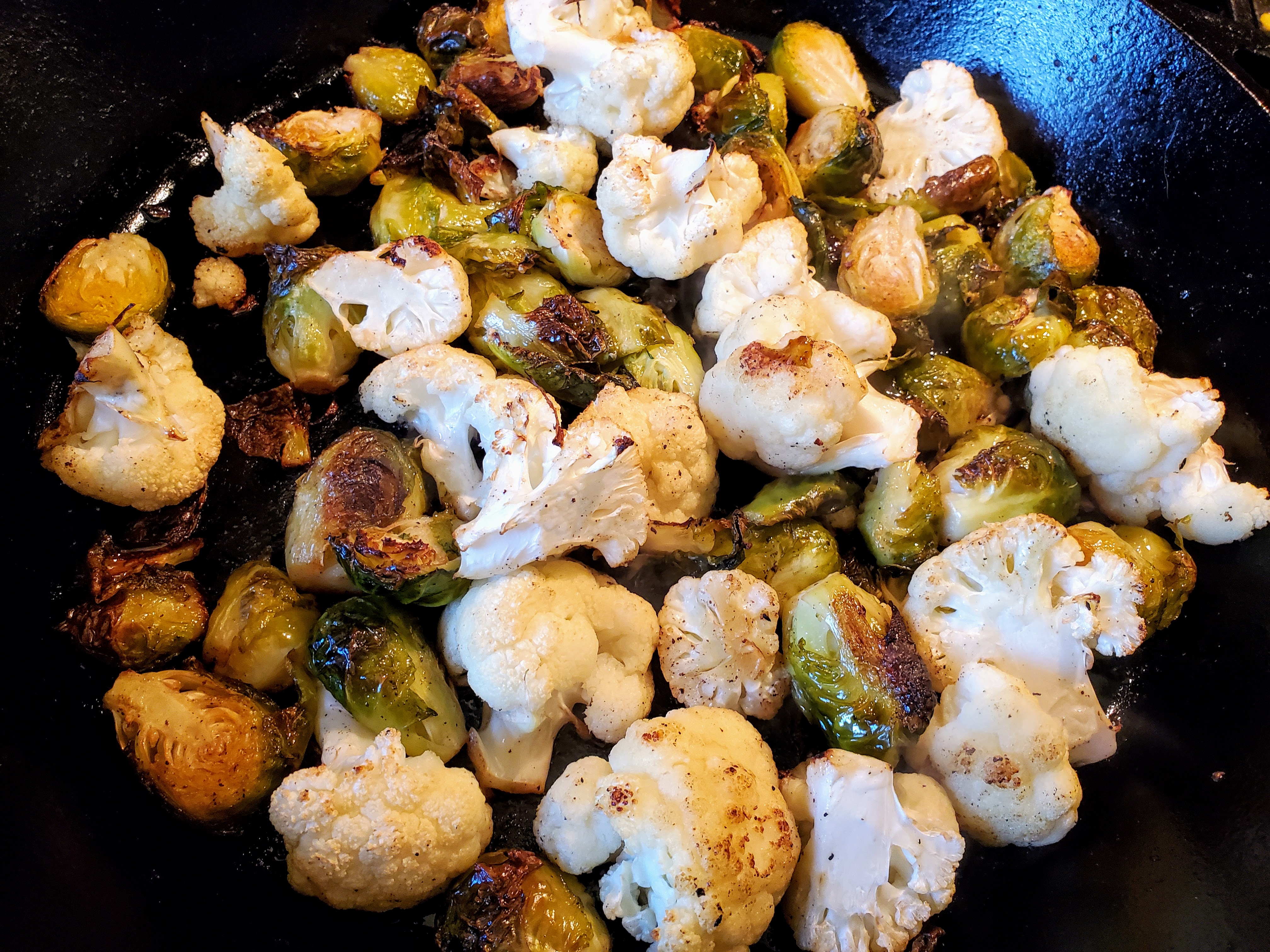 Method: Render the bacon in a large cast iron skillet, and remove. Split the sprouts in half, and break down the cauliflower into florets. Add to the bacon fat, stir thoroughly to coat, and move to a 450F oven for thirty (30) minutes, stirring once halfway through. Remove to stovetop, add balsamic, and season with salt and pepper to taste. Serve hot.