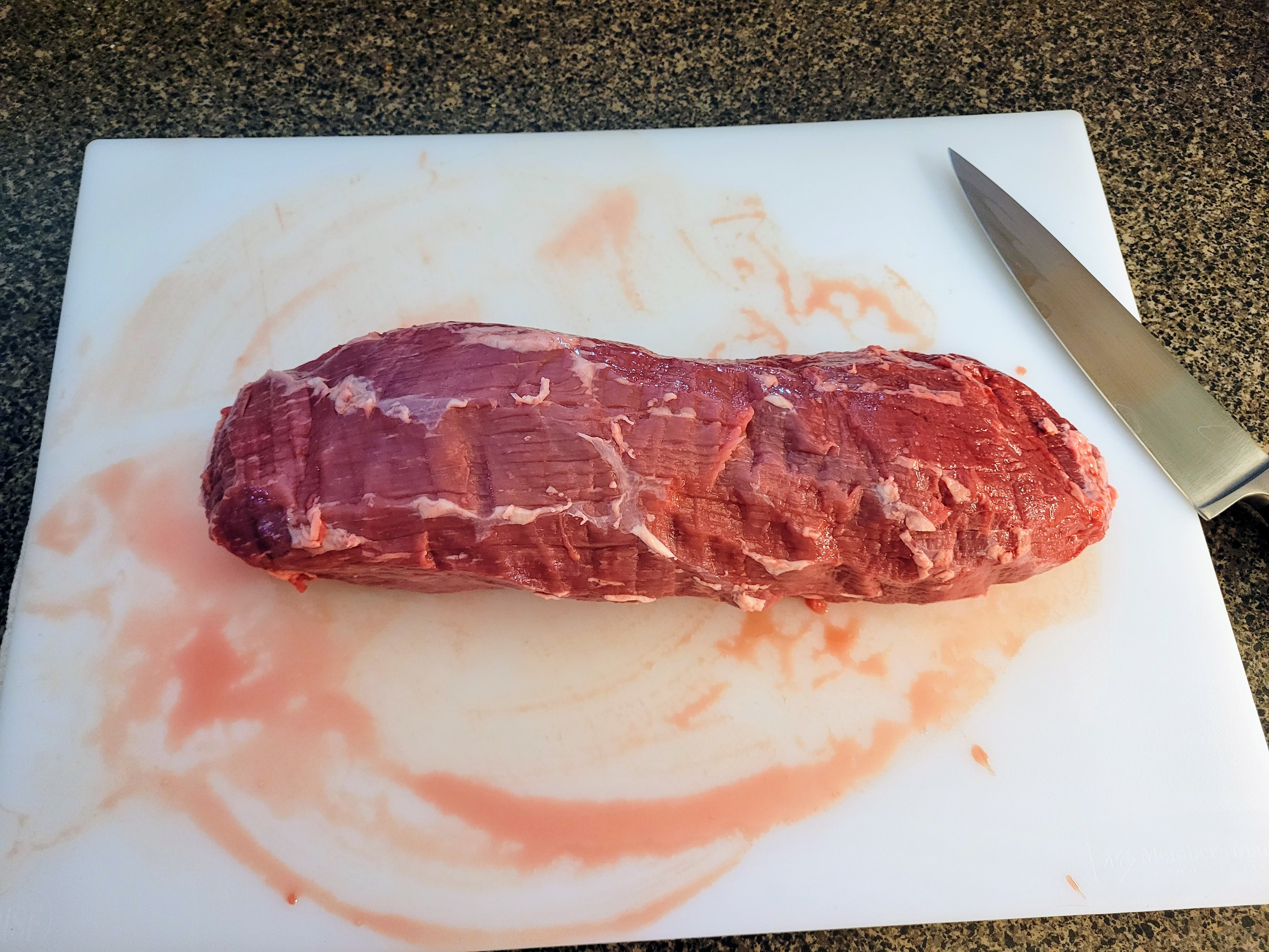 This is what we’re working with. The few areas of exterior fat have to come off. The good news is there are no bones, and almost no internal fat (unlike, say, a ribeye). Take your time, but it really shouldn’t be a long job: