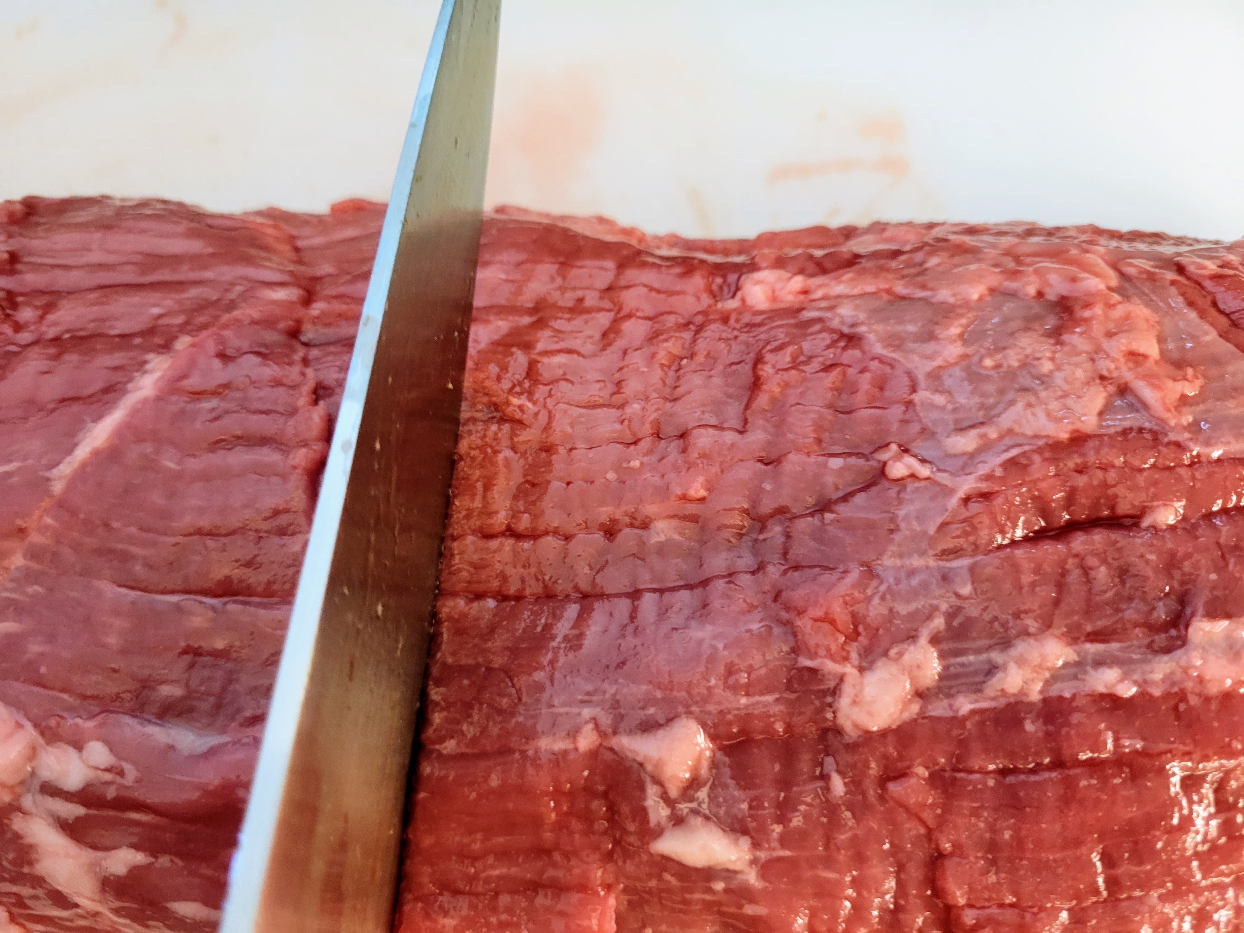 Those horizontal lines aren’t cuts; they’re the natural structure of the meat. And we want to attack them like this: