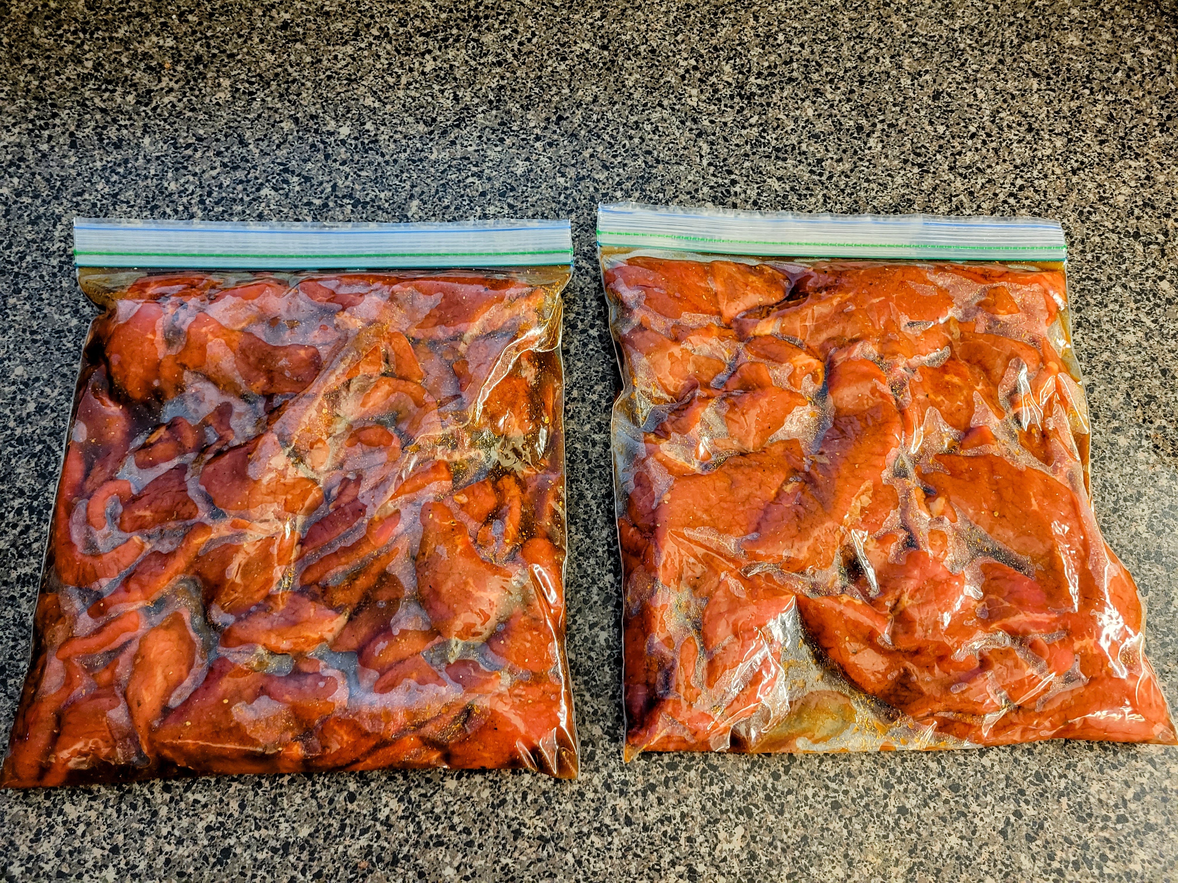 As you can see from the photo above, I divided the strips into two plastic bags. In goes the brine: