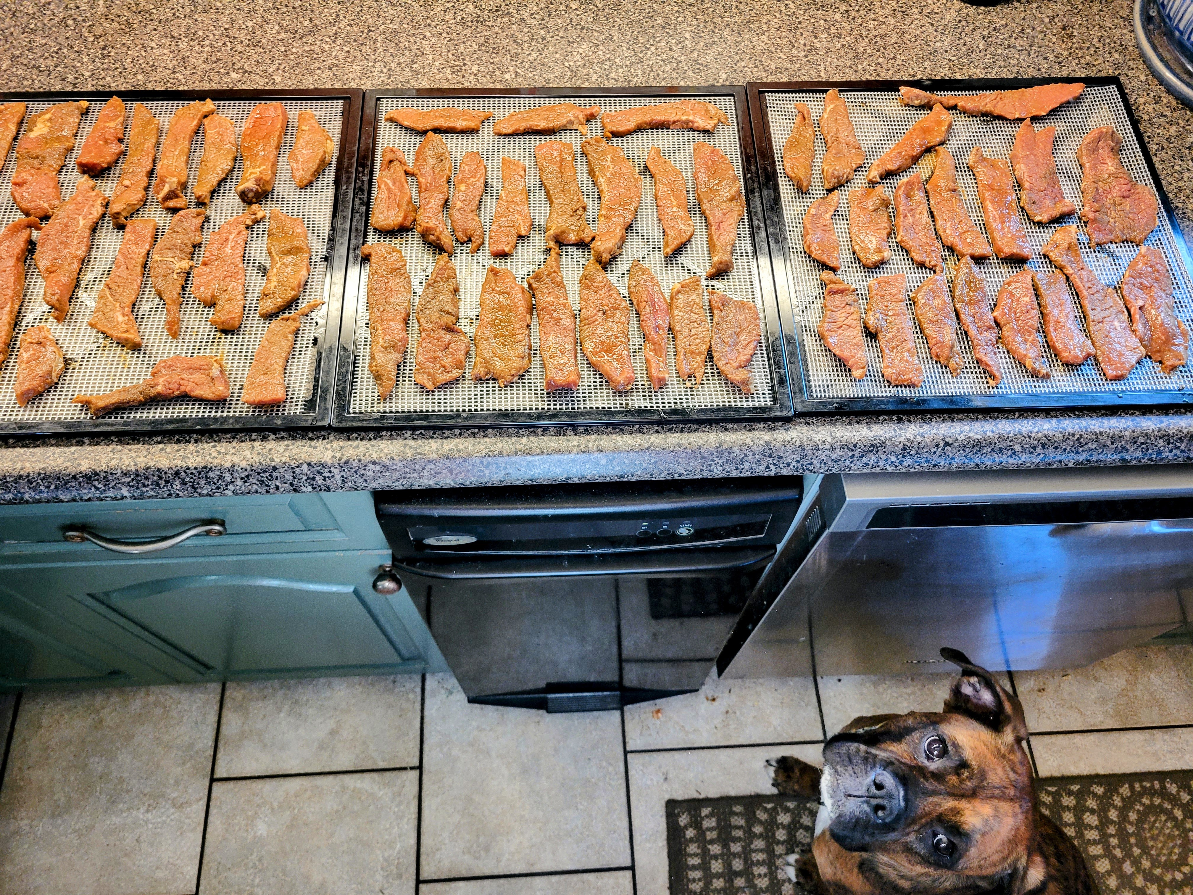 The second way to go about this is with a smoker. The goal is relatively low-temp smoke, like 165F,so you’re going to be doing a lot of firebox maintenance to ensure you don’t end up with salty charcoal instead of jerky. Further, jerky takes up a lot of space. It’s all flat, and needs to be spaced to let air circulate around each piece, which (for most smokers) may require some creative modification to accomplish. But, if you can master this method and have the time, I think the final product is superior to a dehydrator.