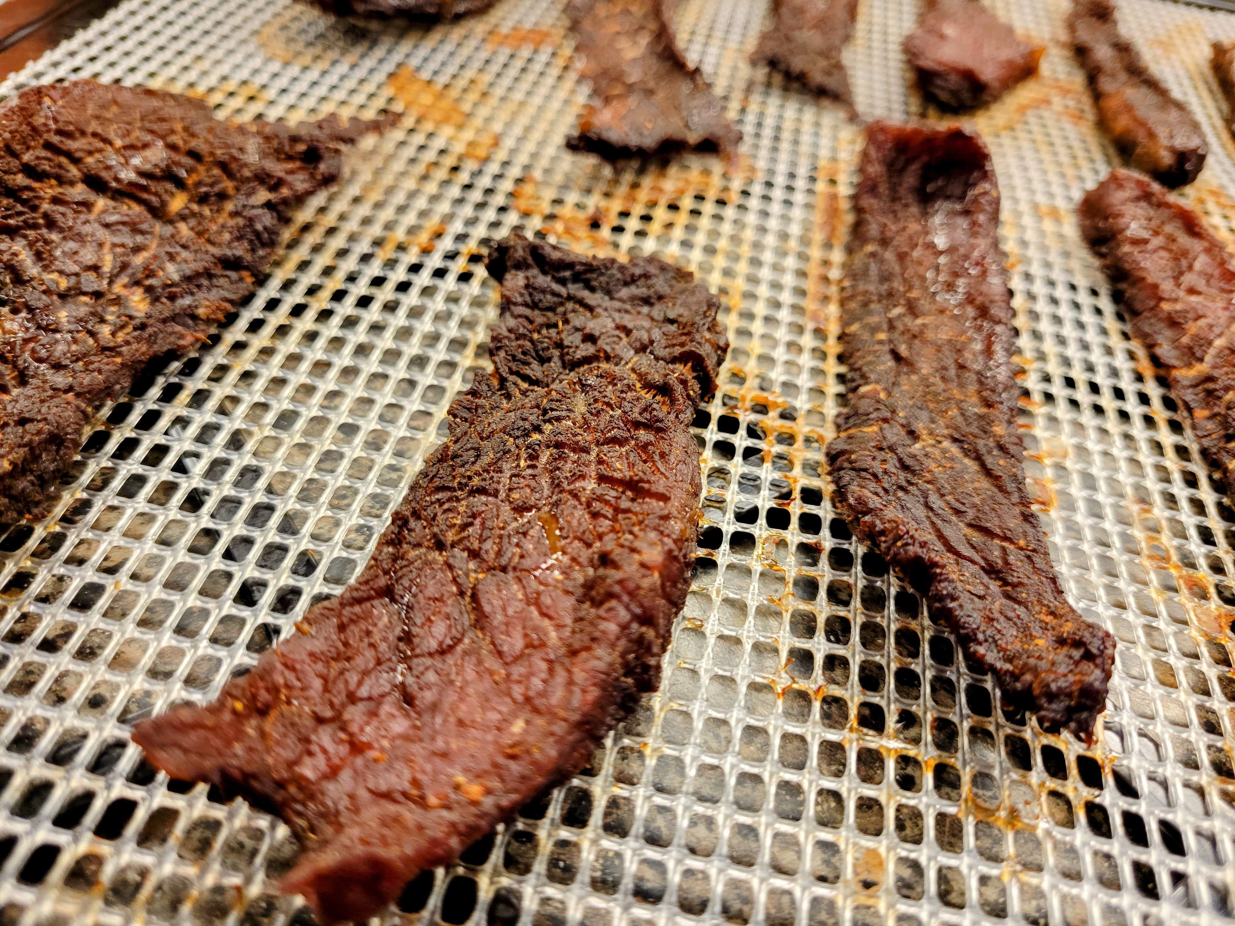So, jerky out of the brine and onto your preferred method of drying. How long? Well, it completely depends on your method, your temp, the thickness of the meat strips, the ambient humidity, and the relative position of Venus in the Sixth House (okay, maybe not that last one). With my dehydrator running at 165F, most of this will be perfect in about six (6) hours, with a few of the thicker pieces taking up to eight (8).