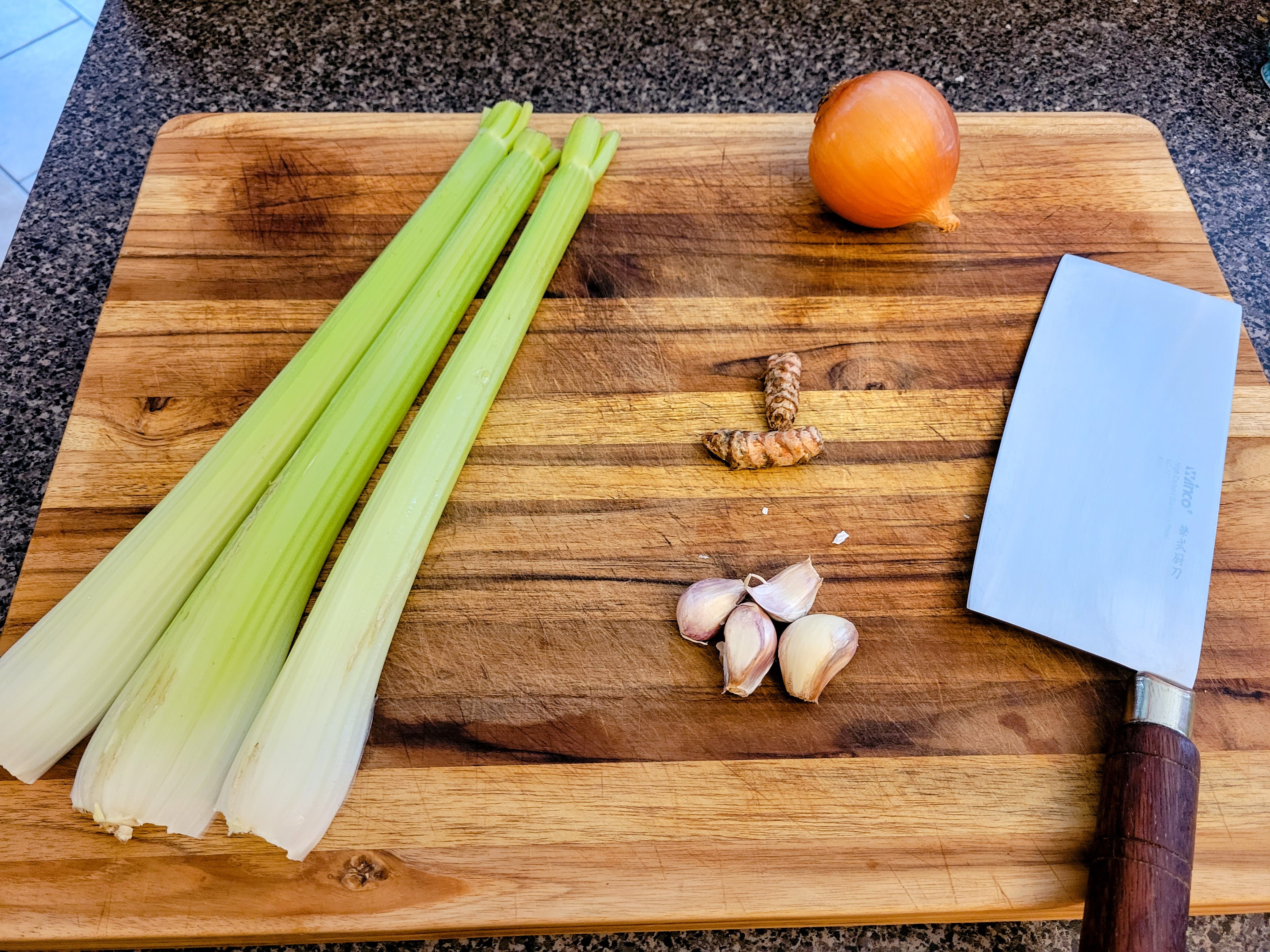 This is it: celery, onion, garlic, and those grub-looking things in the middle are our fresh turmeric (more on that in a minute). Go ahead and chop down the celery and onion first, and don’t worry too much about your knife work. This is all headed for the blender: