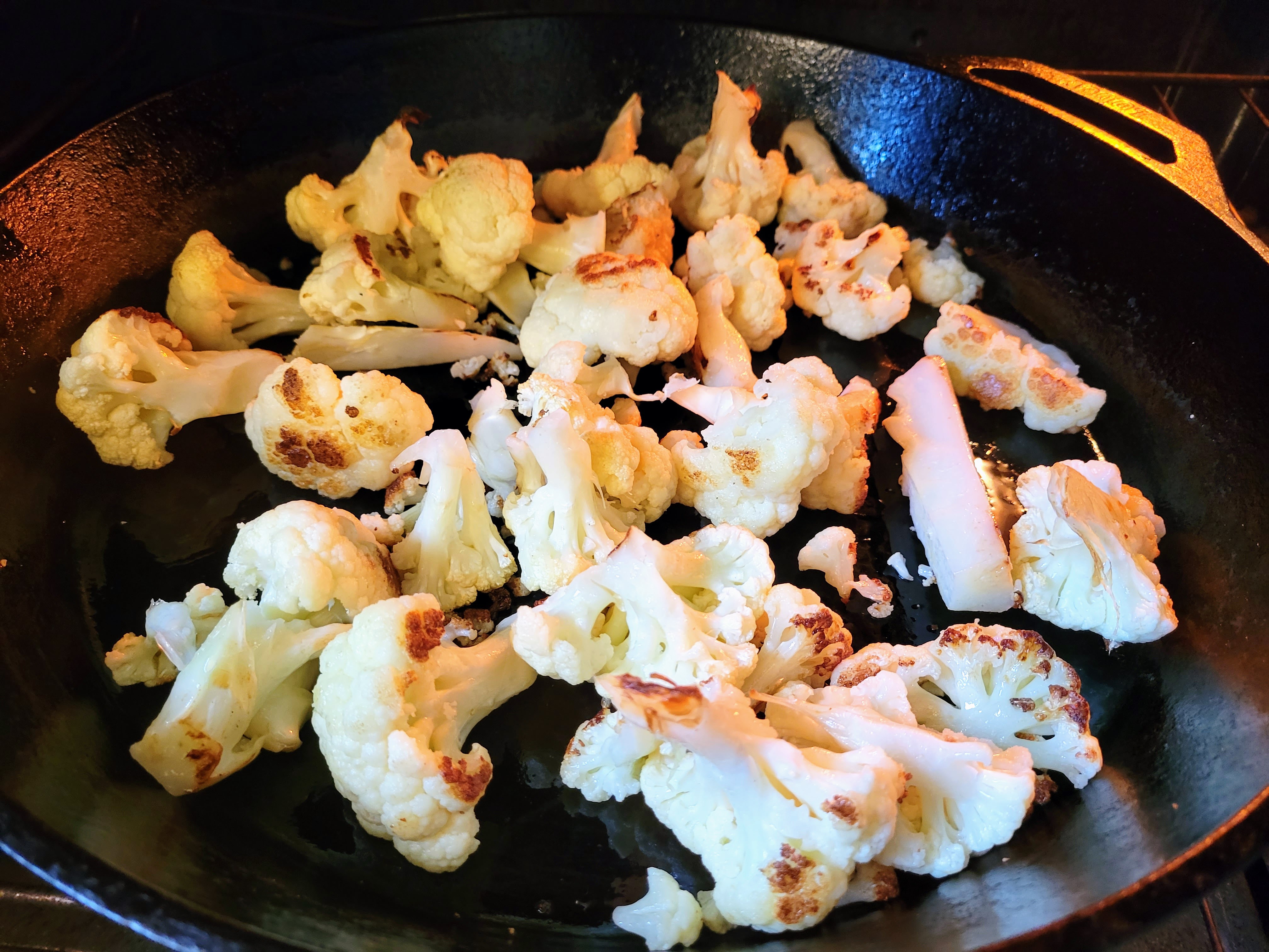 Good patches of color starting to form, and these need to be tossed/turned. You may actually have to get some tongs for the more stubborn bits, as cauliflower for some reason hates to roll over. All the way through and out of the oven: