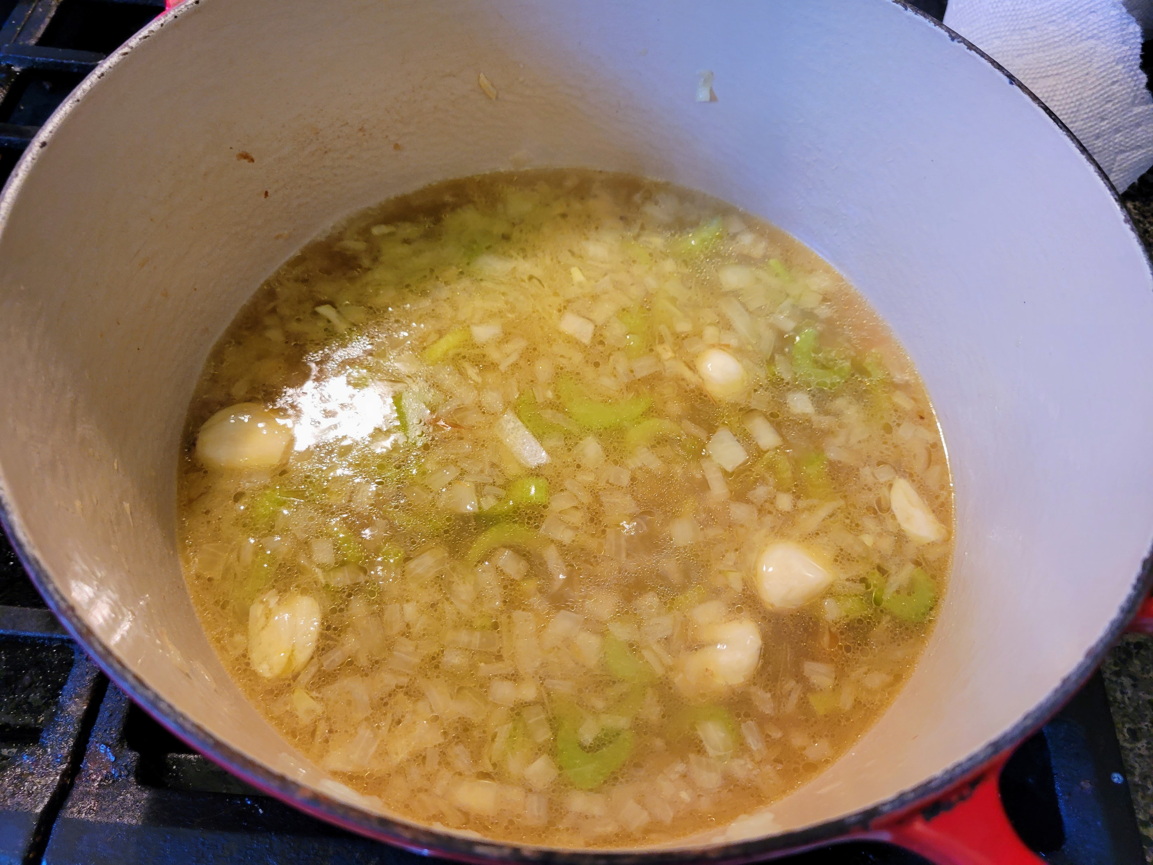 Let this sweat for another five (5) minutes or so, then cover with your chicken stock and let simmer for another five (5) minutes: