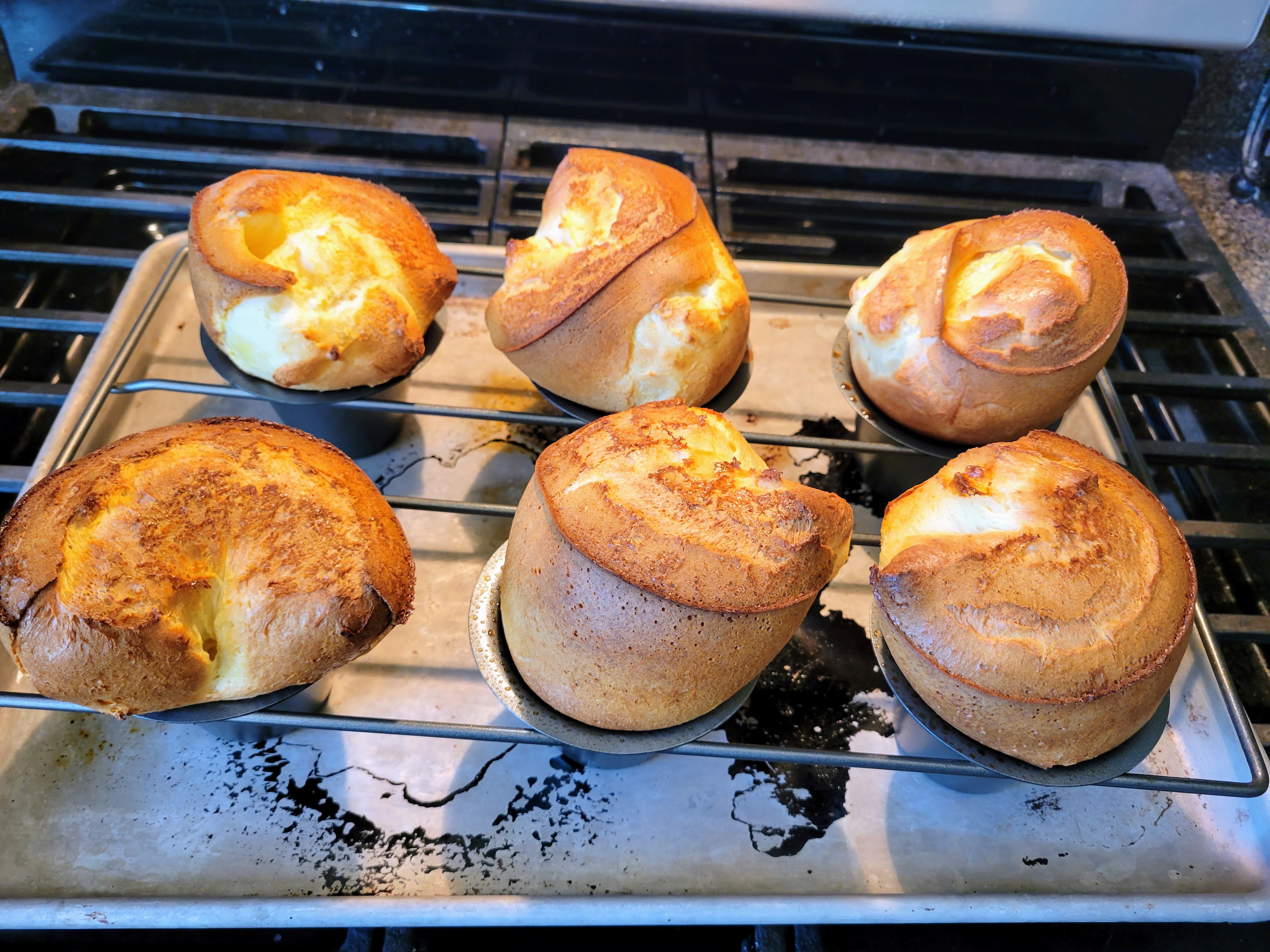 I will also point out here that, in developing this recipe, I tried several different methods, from cold popover pan, to pre-heating at 400F, to heating on a sheet pan versus without, and this is the best method for those towering, crispy poofs we’re looking for. I did find, however, that using a cold pan or lower heat provides a more stable bottom “cup,” for whatever that’s worth. In the event you’re planning on filling these with soup or ice cream or something, that may be a consideration, but for now, into the oven at 450F.