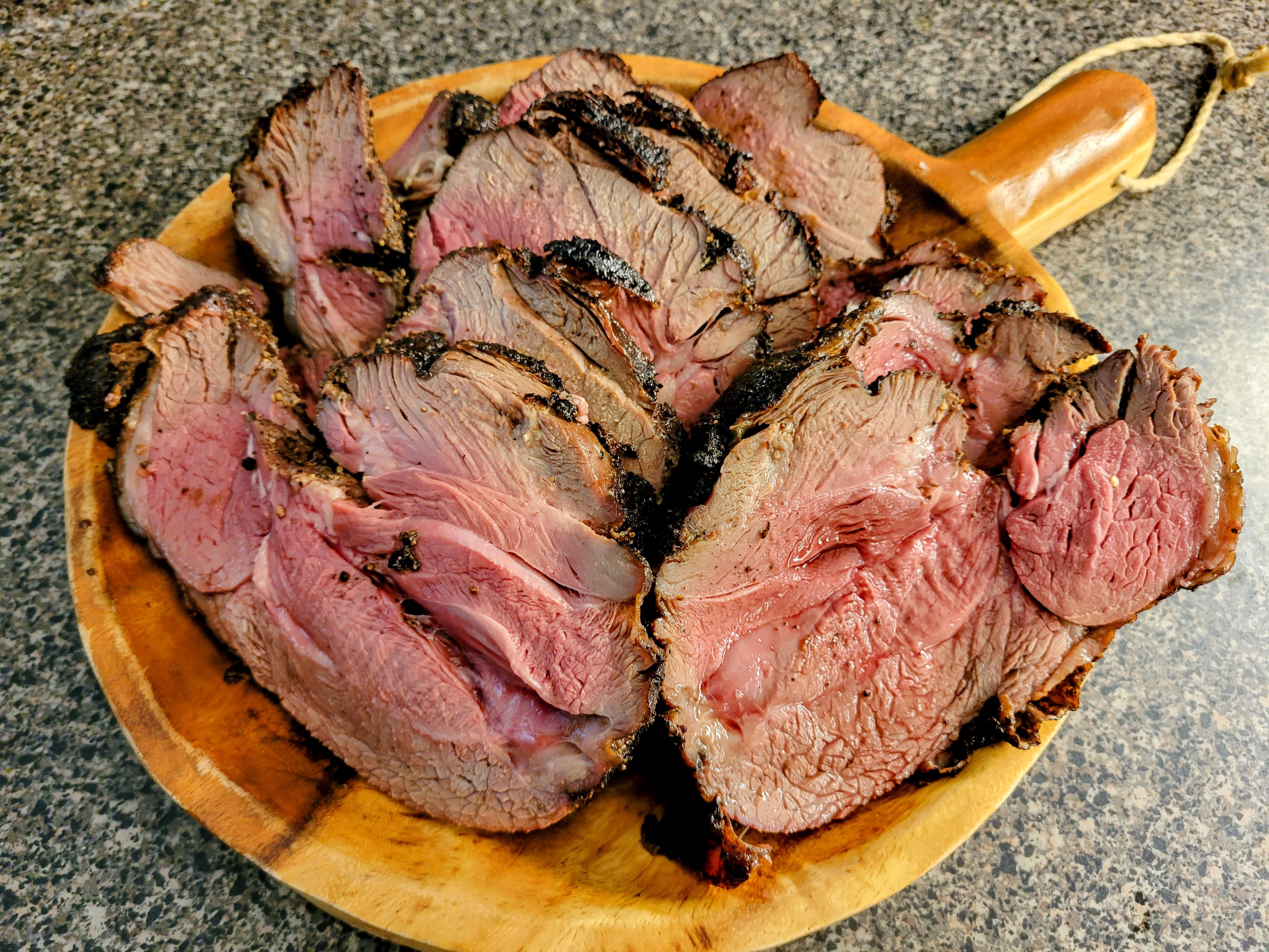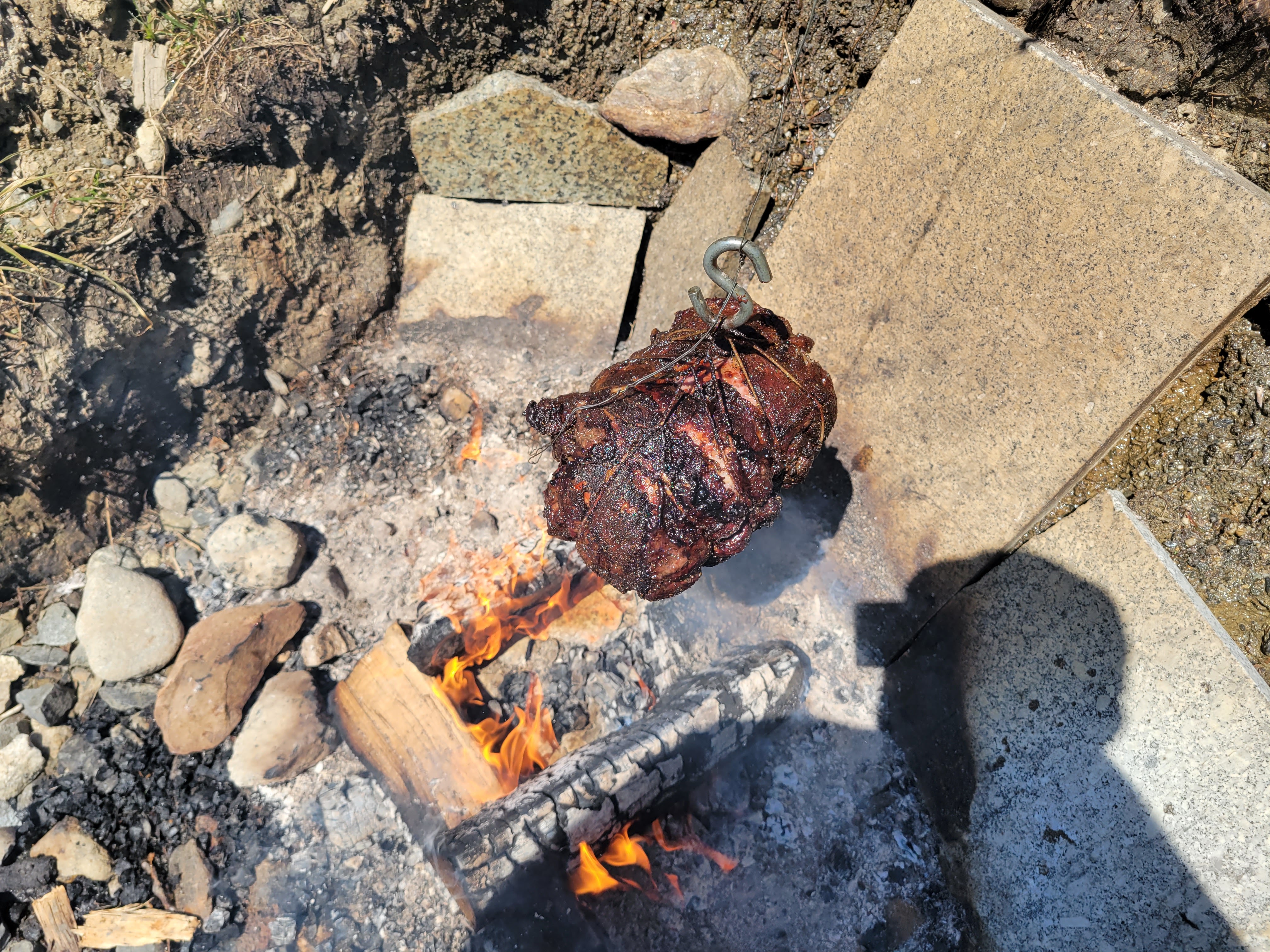 This is a pork loin roast (we’ll get there), but it’s an entirely different food product. It’s not smoked, it’s not grilled, it’s not roasted. It’s something unique and alchemical; it’s the culmination of patience, intent, and attention. It is the climax of a sun-drenched afternoon in the yard, spent poking a woodfire and – as the kids say – touching grass.