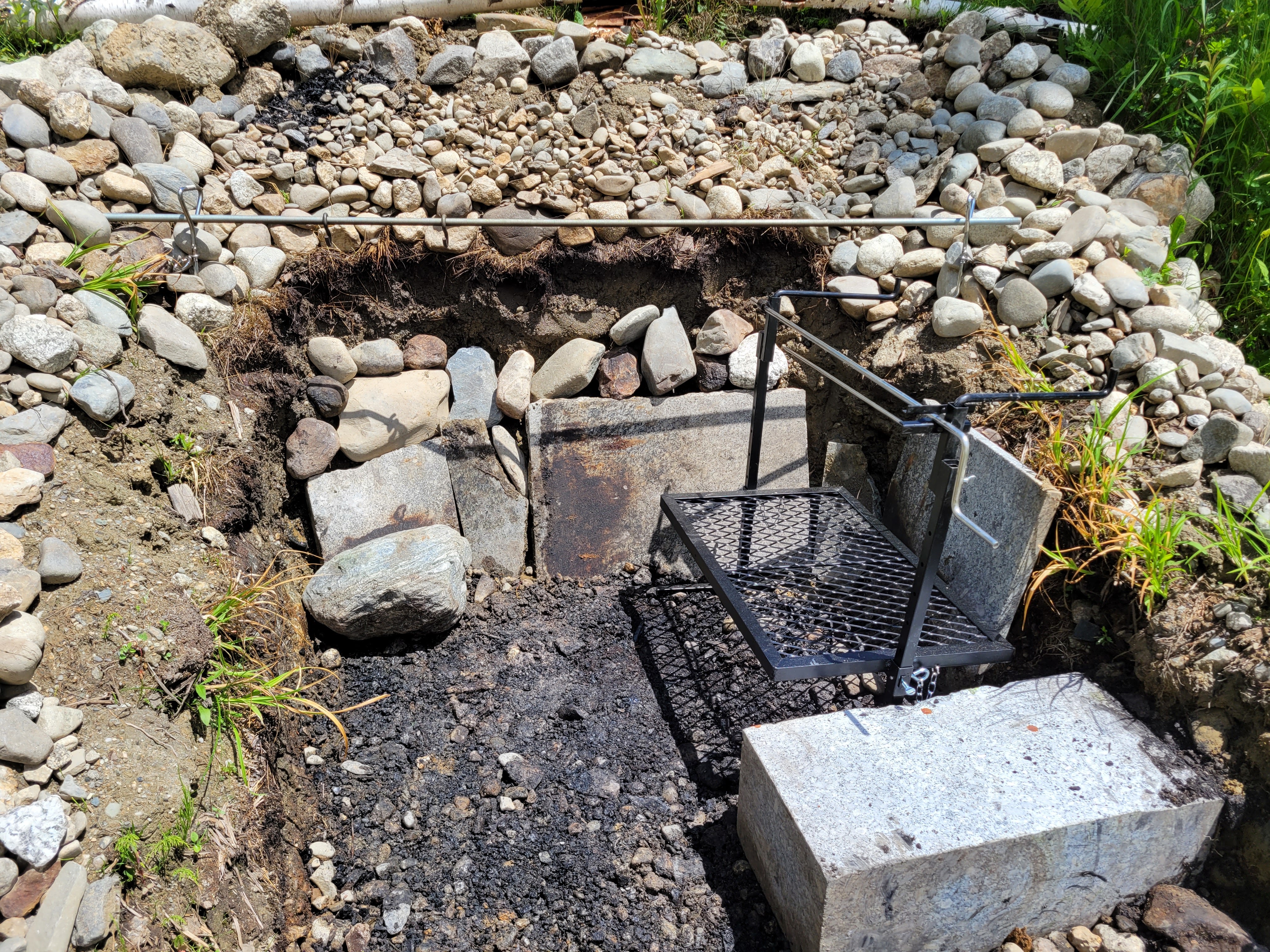 With some additional rock work, the first night was time for a test-fire with some marshmallow toasting sticks. Pleasingly, the meat hole-err, summer kitchen, did not collapse or erupt, so I called it a success and started planning some additional rock work: