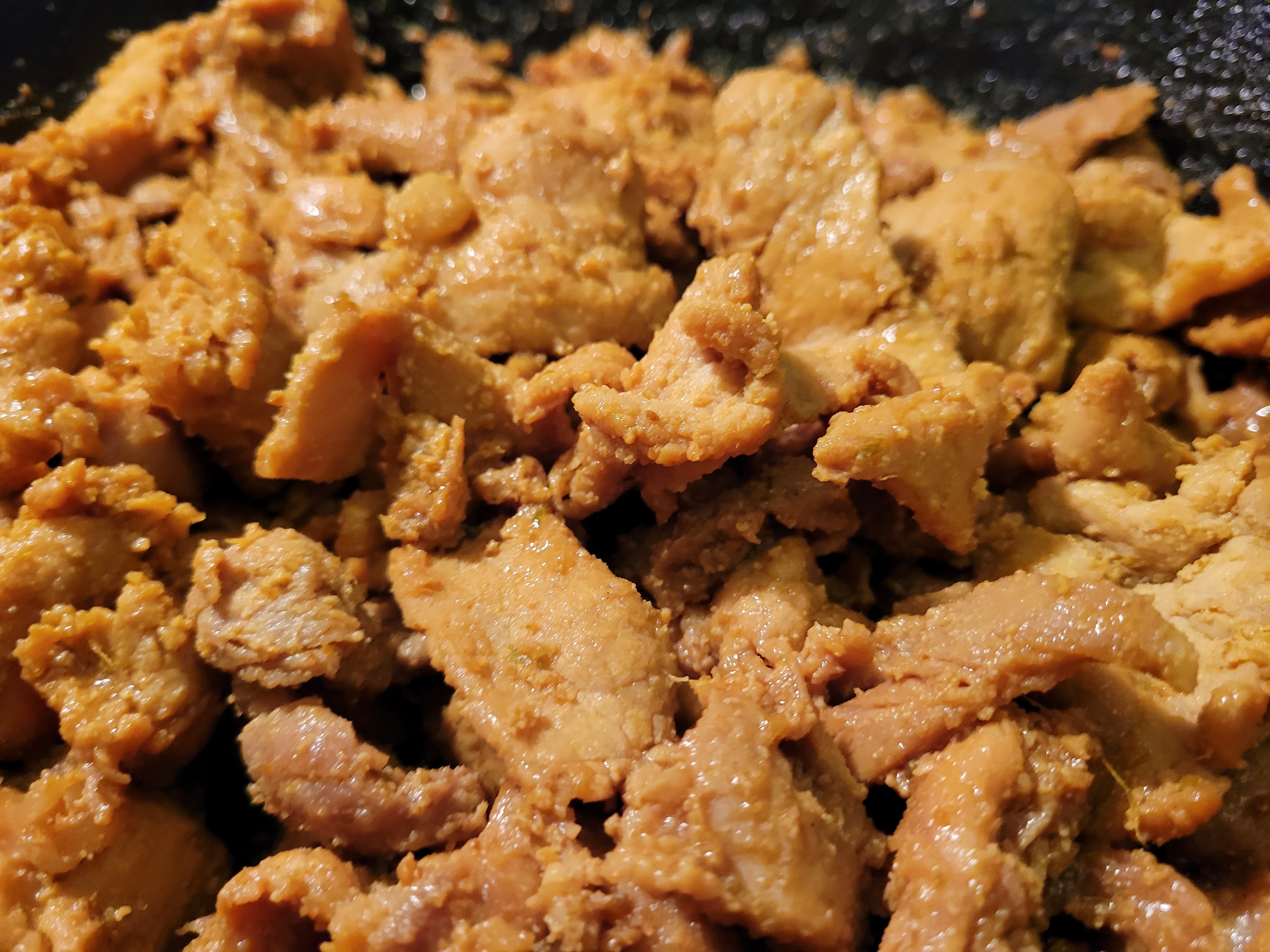 Once the meat is cooked through, remove to a bowl and pump the heat to reduce down the remaining liquid, and taste it for seasoning. It may need a little more salt, or not. By the way, it should taste pretty potent. This isn’t a soup; you’re only getting a thin coating on the outside of the pork.
